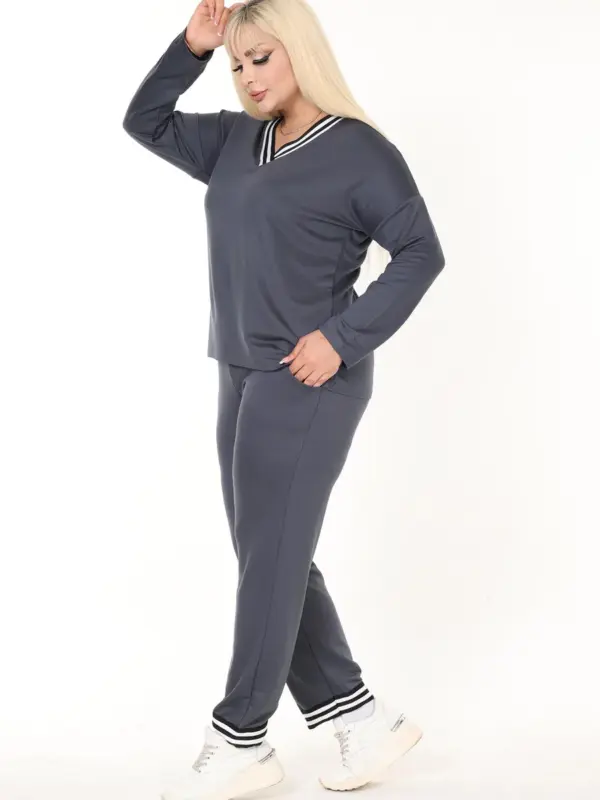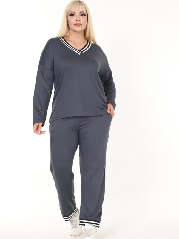 Ovaj udoban i ležeran dvodjelni set idealan je za svakodnevne aktivnosti i opuštene kombinacije. Gornji dio ima V-okovratnik i porub, što mu daje klasičan sportski izgled, dok donji dio s gumom u struku osigurava udobnost i prilagodljivost figuri. Lagani materijal pruža osjećaj slobode i udobnosti tokom nošenja.