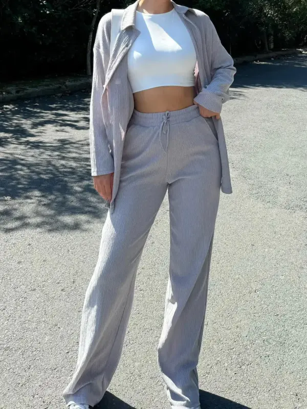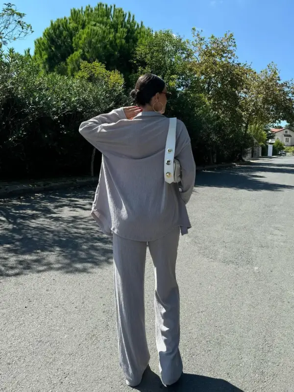 Udoban, ležeran i trendi! Ovaj oversize basic dvodjelni set sastoji se od košulje širokog kroja i širokih šalvara s gumom u struku za maksimalnu udobnost. Zahvaljujući elastinu u materijalu, set pruža lagan osjećaj tokom nošenja.