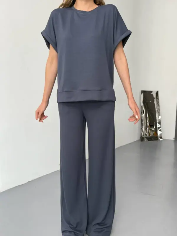 Majica je opuštenog kroja s kratkim rukavima i blagim prorezima sa strane na donjem rubu. Hlače su širokih nogavica s udobnom gumom u struku i vezicom za prilagođavanje. Izrađen od mekanog materijala, ovaj set pruža maksimalnu udobnost tokom cijelog dana. Dostupan u svijetlo sivoj i tamno sivoj boji.