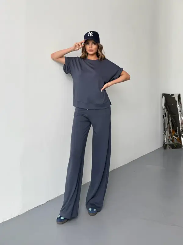 Majica je opuštenog kroja s kratkim rukavima i blagim prorezima sa strane na donjem rubu. Hlače su širokih nogavica s udobnom gumom u struku i vezicom za prilagođavanje. Izrađen od mekanog materijala, ovaj set pruža maksimalnu udobnost tokom cijelog dana. Dostupan u svijetlo sivoj i tamno sivoj boji.