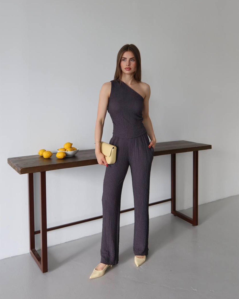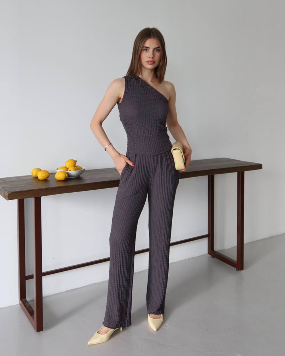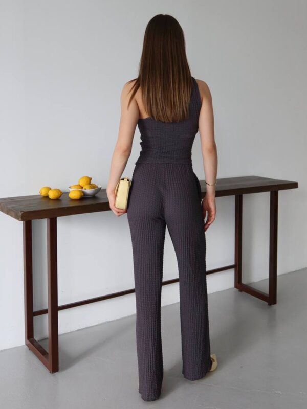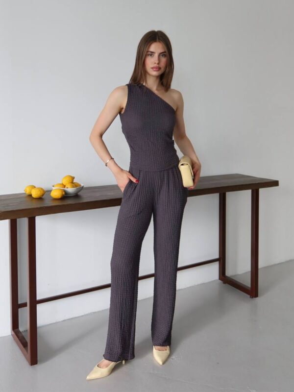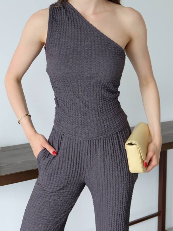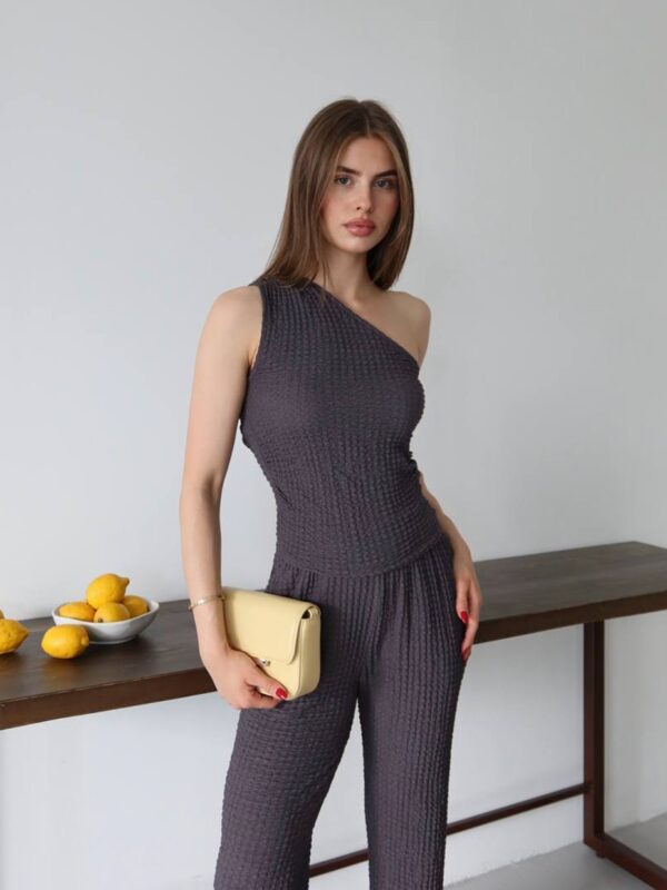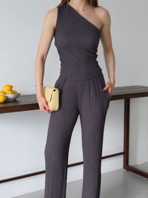 Ako tražiš komad koji savršeno balansira udobnost i stil – upravo si ga pronašla. Ovaj dvodijelni set od mekanog, teksturiranog materijala stvoren je za svakodnevne modne pobjede. Top s asimetričnim, jedno-ramenim izrezom donosi trendi momenat, dok široke pantalone s elastičnim pojasom oblikuju siluetu i pružaju maksimalnu udobnost, bilo za gradske kafe, vikend bijeg ili spontani photoshoot.