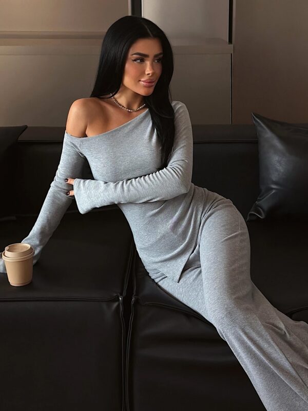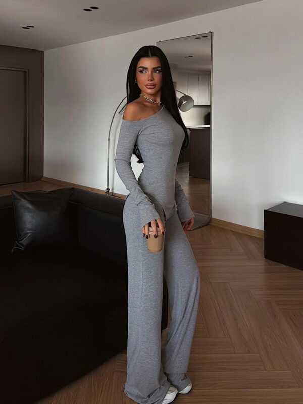 Set čine bluza spuštenih ramena i široke pantalone sa gumom u struku. Gornji dio ima asimetričan kroj koji vizualno ističe struk, dok ravne nogavice pantalona produžuju figuru.