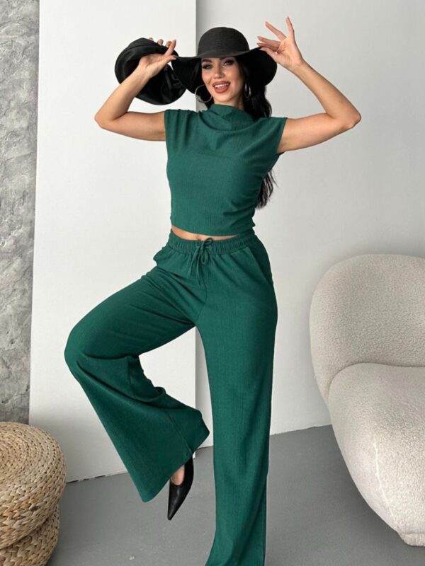 Set čine bluza spuštenih ramena i široke pantalone sa gumom u struku. Gornji dio ima asimetričan kroj koji vizualno ističe struk, dok ravne nogavice pantalona produžuju figuru.