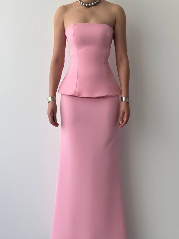 Savršen spoj sofisticiranog minimalizma i ženstvene siluete. Gornji dio u stilu bandeau topa sa gumom u gornjem porubu nježno grli gornji dio tijela i sprječava klizanje, te je obilježen je elegantnim peplum rubom koji suptilno naglašava struk. Pencil suknja dužine do gležnjeva prati liniju bokova i sužava se pri koljenima, stvarajući efekt “sirene” pri svakom pokretu.