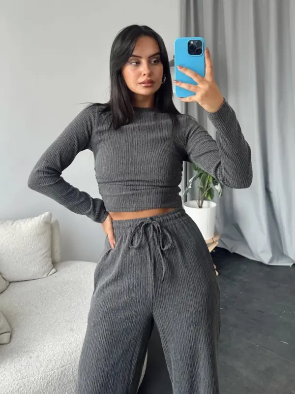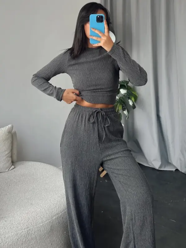 Ovaj dvodjelni set spaja jednostavnost i udobnost, idealan za svakodnevni ležerni stil. Gornji dio ima basic dizajn s blagim naborima u struku, naglašavajući figuru bez previše detalja. Donji dio čine široke palazzo hlače s elastičnom gumom u struku, pružajući udobnost i slobodu pokreta.