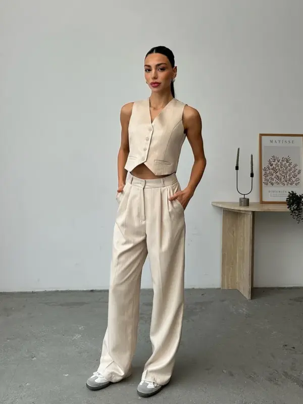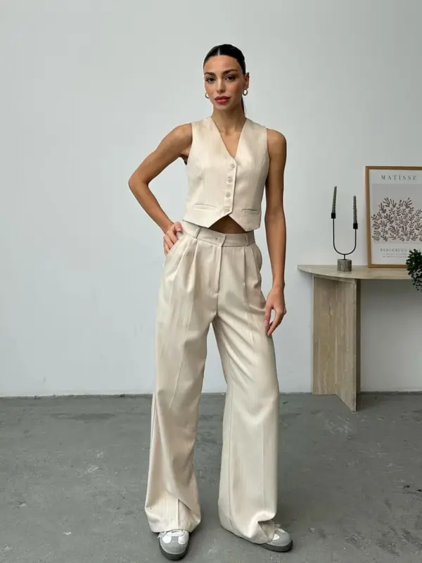 Ovaj stilizirani dvodjelni set kombinuje klasičan prsluk crop kroja i šire palazzo hlače, stvarajući modernu, ali sofisticiranu kombinaciju. Vertikalne pruge vizuelno izdužuju figuru, dok opušteni kroj donosi udobnost i eleganciju. Oba dijela se mogu nositi zajedno za upečatljiv izgled ili kombinovati s drugim komadima za različite prilike – od poslovnog stila do ležernih izlazaka.
