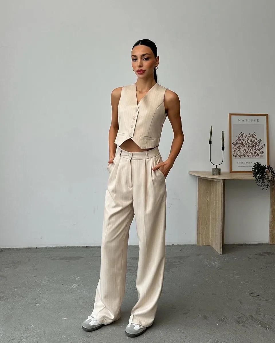 Ovaj stilizirani dvodjelni set kombinuje klasičan prsluk crop kroja i šire palazzo hlače, stvarajući modernu, ali sofisticiranu kombinaciju. Vertikalne pruge vizuelno izdužuju figuru, dok opušteni kroj donosi udobnost i eleganciju. Oba dijela se mogu nositi zajedno za upečatljiv izgled ili kombinovati s drugim komadima za različite prilike – od poslovnog stila do ležernih izlazaka.