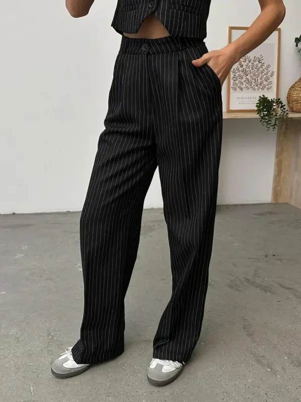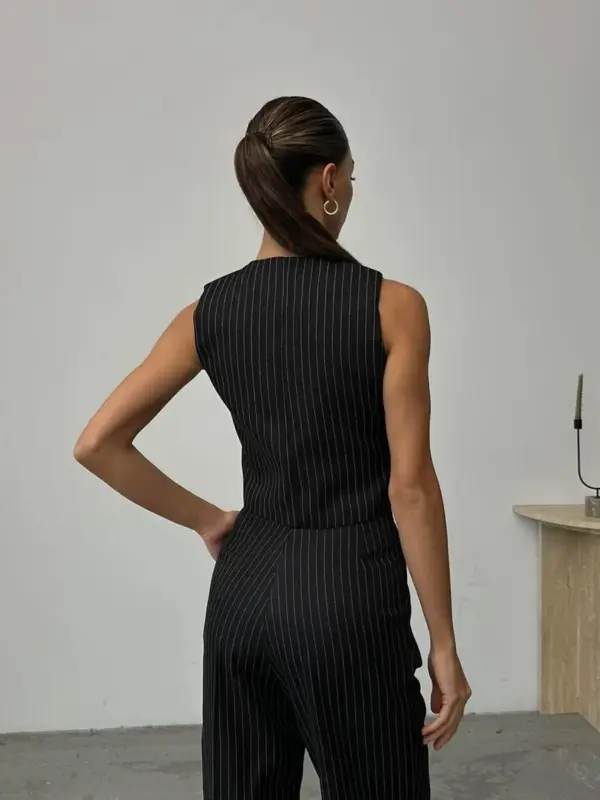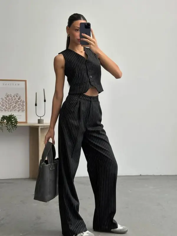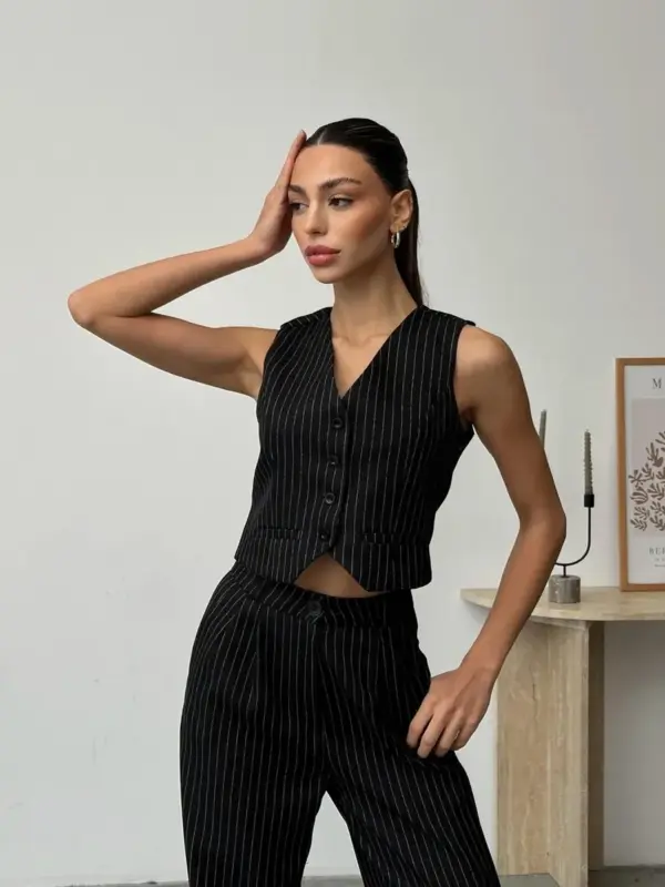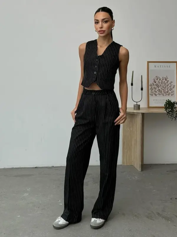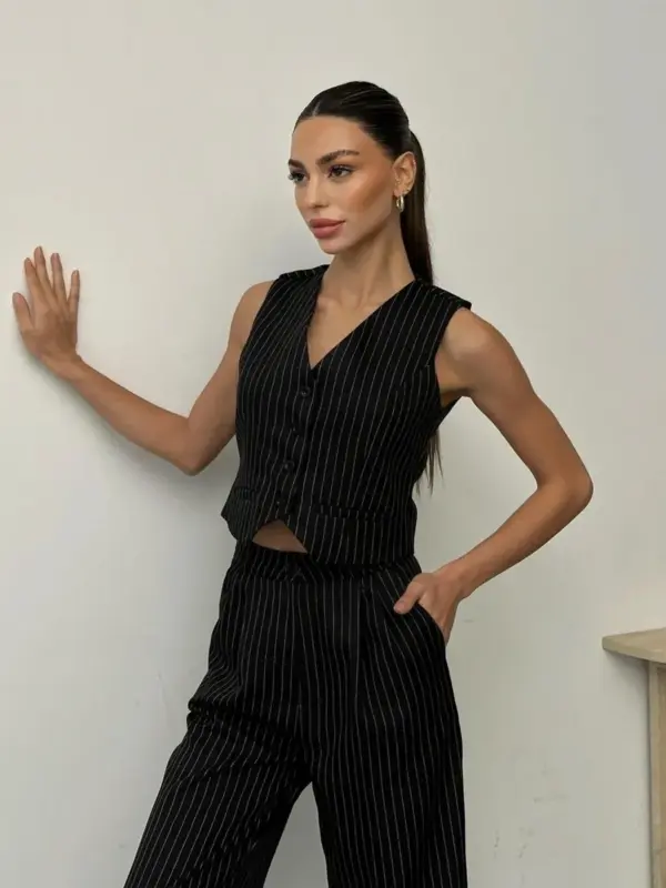 Ovaj stilizirani dvodjelni set kombinuje klasičan prsluk crop kroja i šire palazzo hlače, stvarajući modernu, ali sofisticiranu kombinaciju. Vertikalne pruge vizuelno izdužuju figuru, dok opušteni kroj donosi udobnost i eleganciju. Oba dijela se mogu nositi zajedno za upečatljiv izgled ili kombinovati s drugim komadima za različite prilike – od poslovnog stila do ležernih izlazaka.
