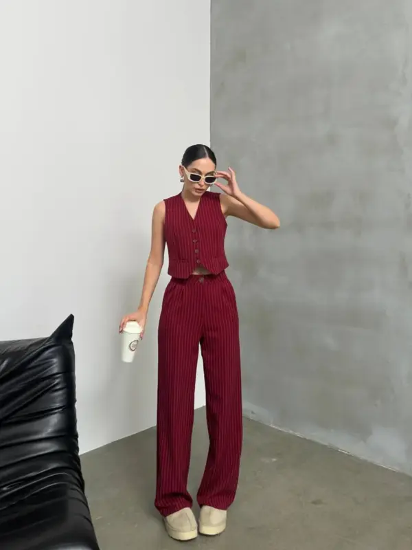 Ovaj stilizirani dvodjelni set kombinuje klasičan prsluk crop kroja i šire palazzo hlače, stvarajući modernu, ali sofisticiranu kombinaciju. Vertikalne pruge vizuelno izdužuju figuru, dok opušteni kroj donosi udobnost i eleganciju. Oba dijela se mogu nositi zajedno za upečatljiv izgled ili kombinovati s drugim komadima za različite prilike – od poslovnog stila do ležernih izlazaka.