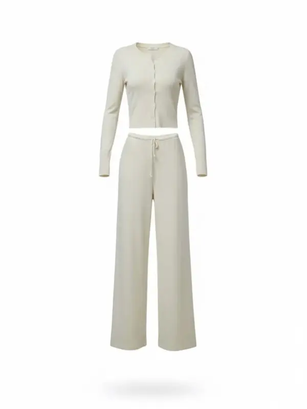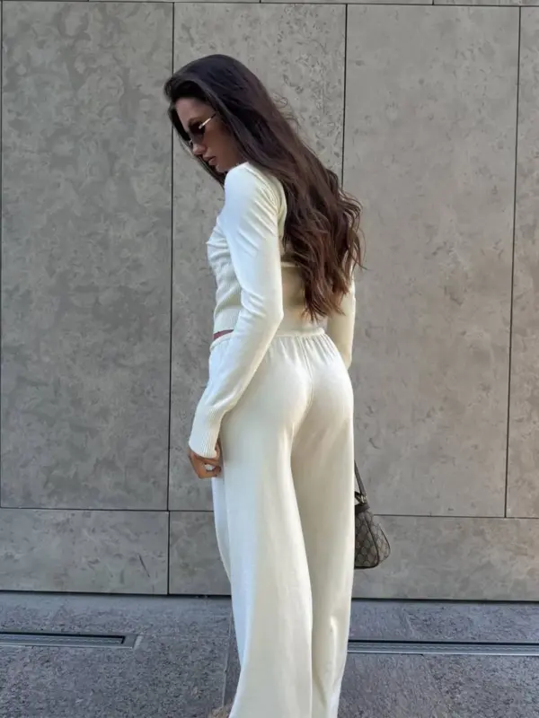 Gornji dio je uski kardigan sa dugim rukavima i dugmićima duž prednje strane, blago pripijen u struku radi naglašene siluete. Donji dio čine ravne pantalone visokog struka sa učkurom u pojasu, koje padaju opušteno niz noge.