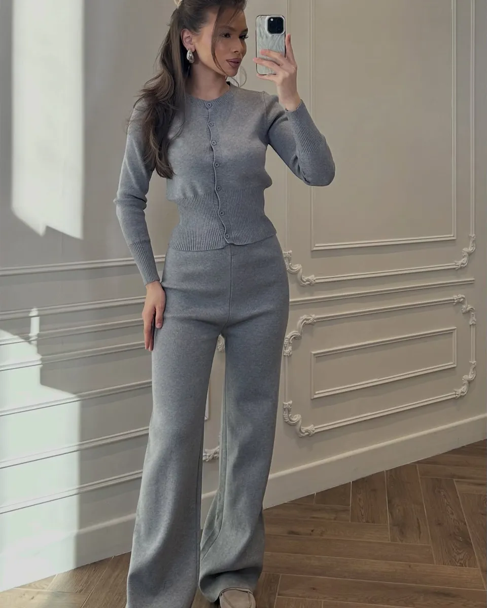 Gornji dio je uski kardigan sa dugim rukavima i dugmićima duž prednje strane, blago pripijen u struku radi naglašene siluete. Donji dio čine ravne pantalone visokog struka sa učkurom u pojasu, koje padaju opušteno niz noge.