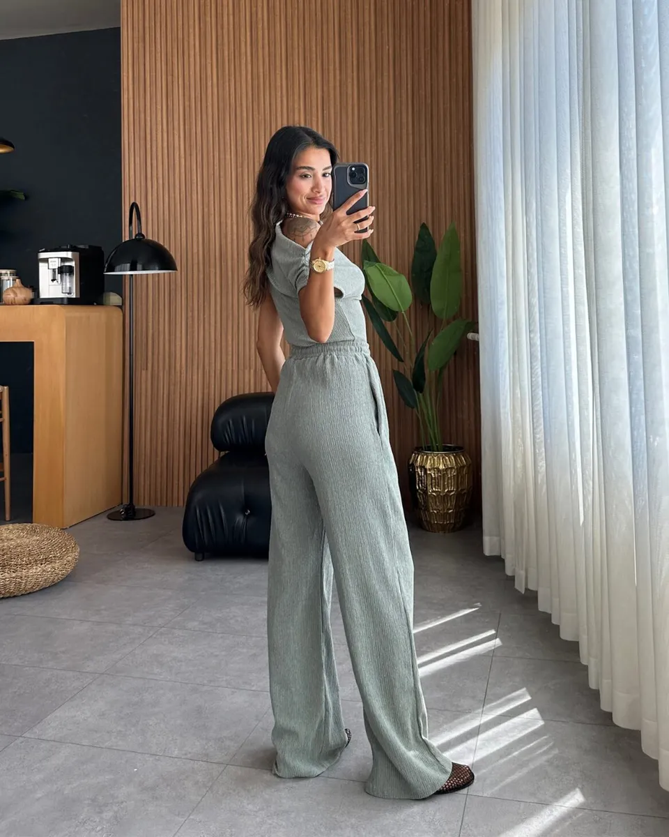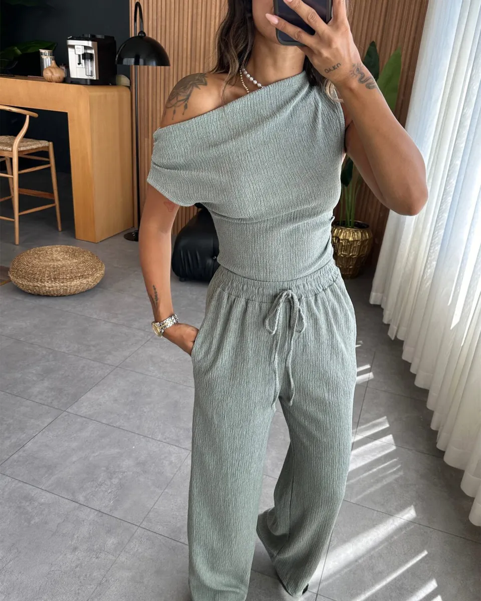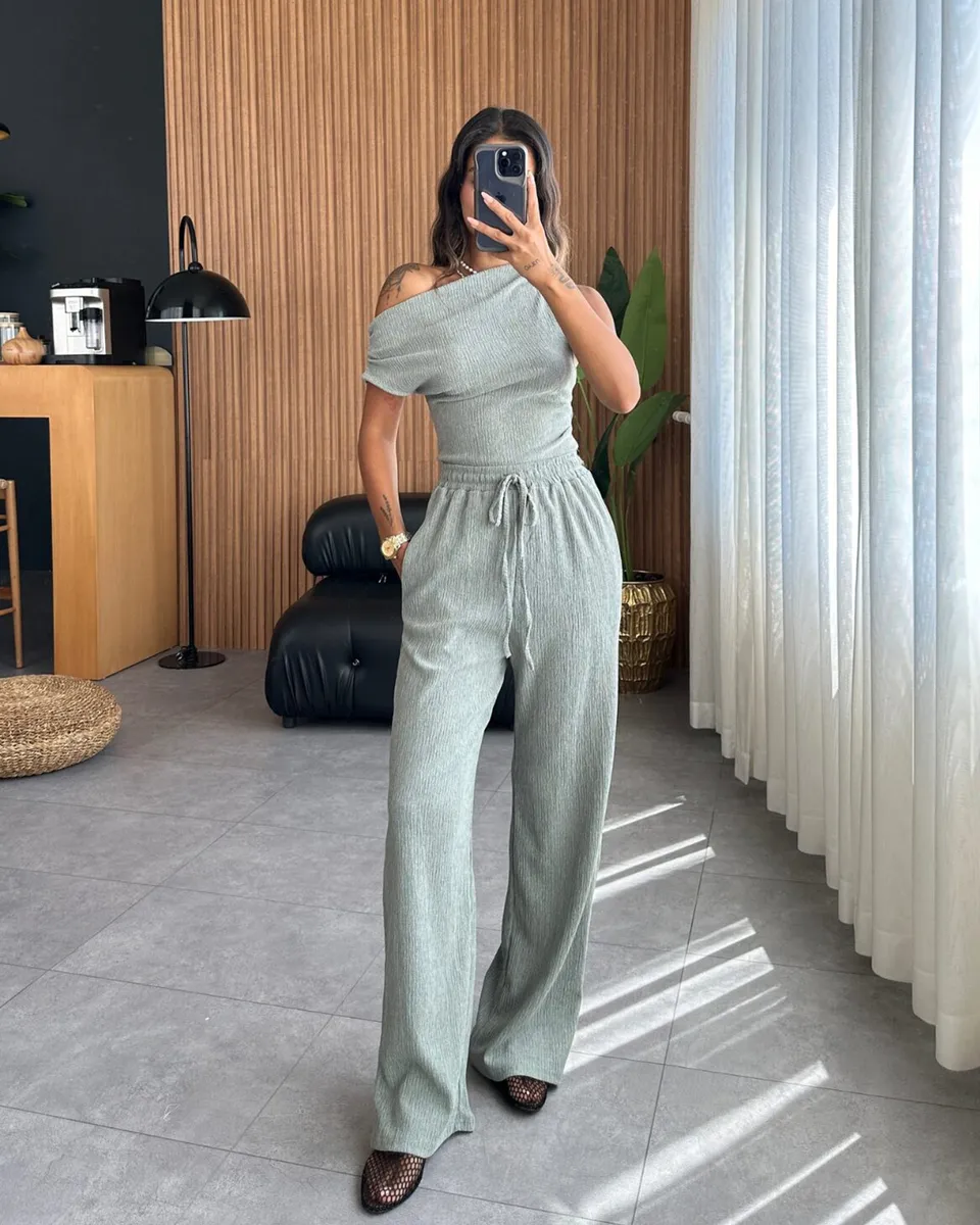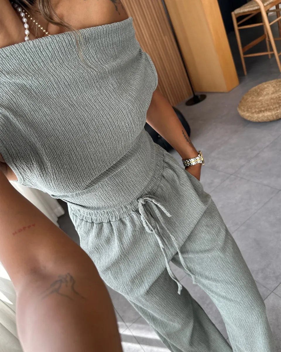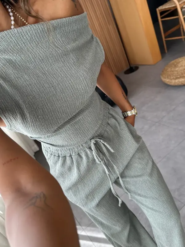 Istaknite se u dvodijelnom setu koji spaja eleganciju i udobnost! Asimetrični crop gornji dio donosi moderan i sofisticiran izgled, dok široke nogavice i guma u struku osiguravaju savršeno pristajanje. Izrađen od rastezljivog materijala, ovaj komplet pruža maksimalnu udobnost i slobodu pokreta. Idealno za svakodnevne kombinacije, ali i za posebne prilike kada želite izgledati trendi i opušteno.