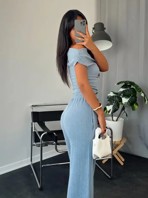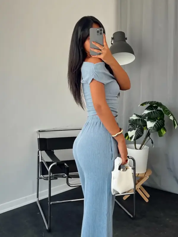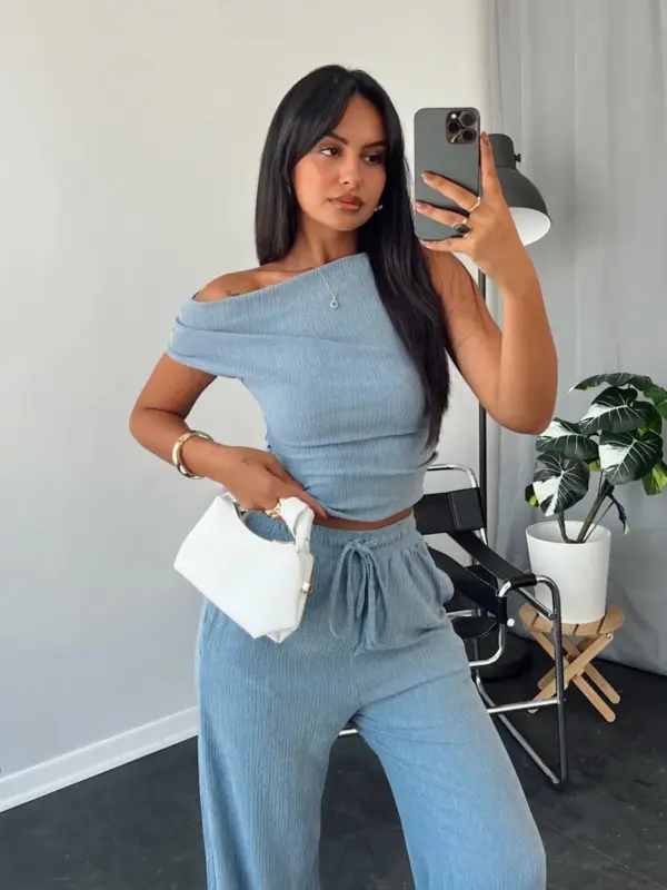 Istaknite se u dvodijelnom setu koji spaja eleganciju i udobnost! Asimetrični crop gornji dio donosi moderan i sofisticiran izgled, dok široke nogavice i guma u struku osiguravaju savršeno pristajanje. Izrađen od rastezljivog materijala, ovaj komplet pruža maksimalnu udobnost i slobodu pokreta. Idealno za svakodnevne kombinacije, ali i za posebne prilike kada želite izgledati trendi i opušteno.