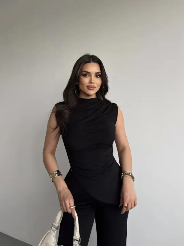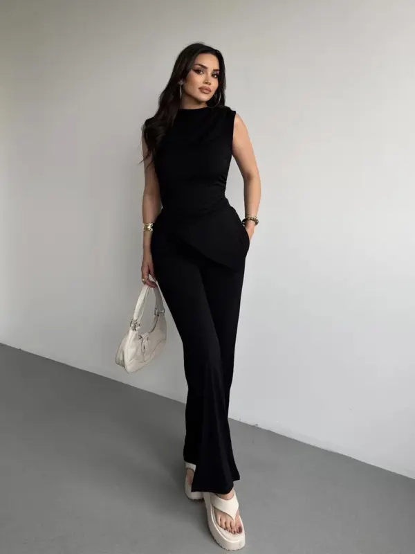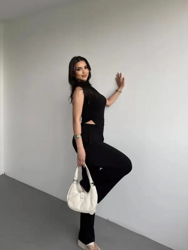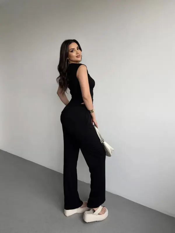 Bez rukava i sa asimetričnim gornjim dijelom, top ističe siluetu na sofisticiran način, dok pantalone visokog struka sa širokim nogavicama i gumom u struku pružaju dozu ležerne elegancije. Rastezljiv i udoban materijal prati liniju tijela, ali i dozvoljava slobodu kretanja – savršen za dan na poslu, afterwork piće ili večernji izlazak.