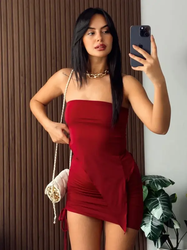 Dvodjelni set sastoji se od mini suknje i asimetričnog gornjeg dijela. Materijal je blago proziran, s gumom u struku za udobno prijanjanje. Dužina suknje može se prilagoditi po želji, dok rukav dolazi odvojeno, pružajući mogućnost različitih stilizacija (primjer na zadnjoj slici). Idealno za one koji vole eksperimentirati s modnim kombinacijama.