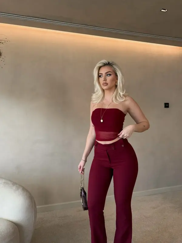 Zasijaj u bordo dvodijelnom setu koji plijeni pažnju gdje god da se pojaviš! Gornji dio je upečatljiv korset kroja bez naramenica, s prozirnim mrežastim detaljem ispod grudi koji daje dozu zavodljivosti i modernog stila. Donji dio čine elegantne duge hlače visokog struka koje savršeno prate liniju tijela, a blago se šire prema dole.