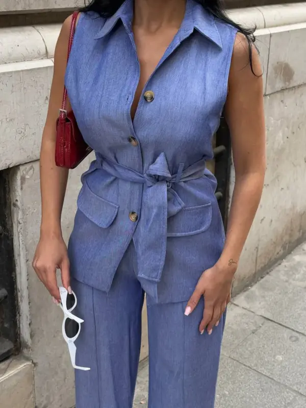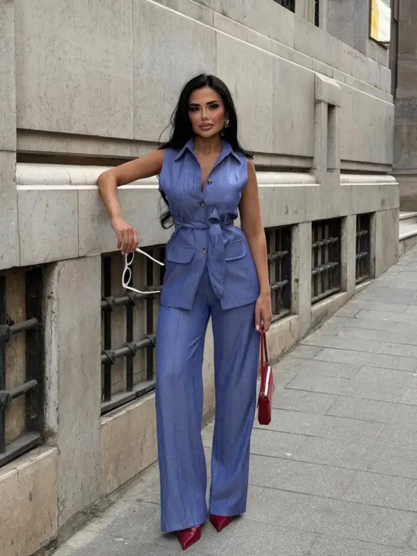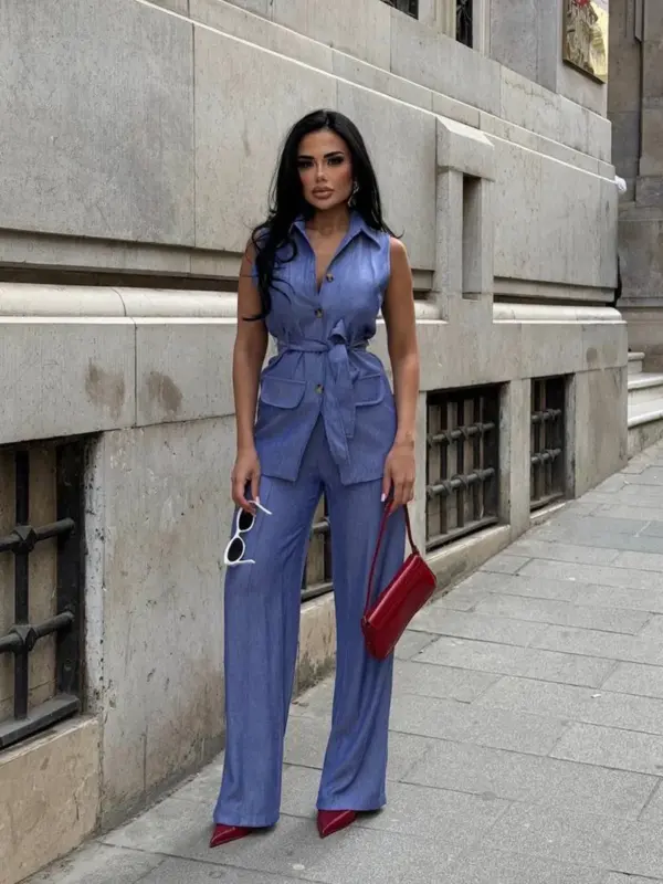 Kreirajte sofisticiran i moderan look s ovim chic dvodijelnim setom u svijetlo plavoj boji! Set se sastoji od elegantnog prsluka na kopčanje i hlača širokih nogavica, savršenog za poslovne prilike i gradske kombinacije.