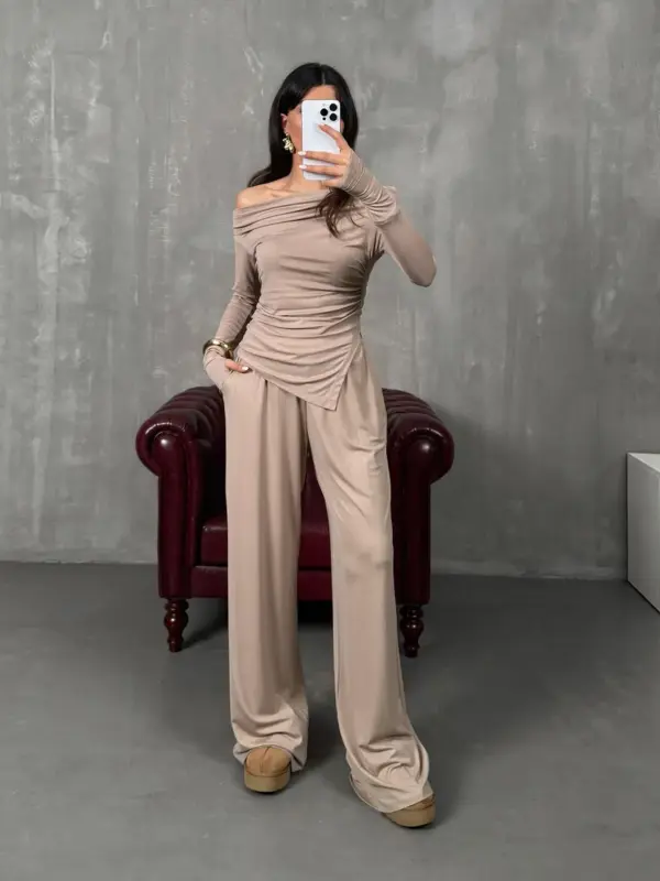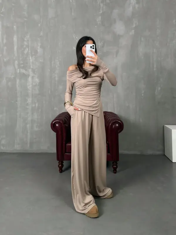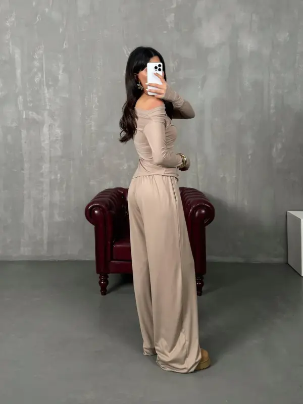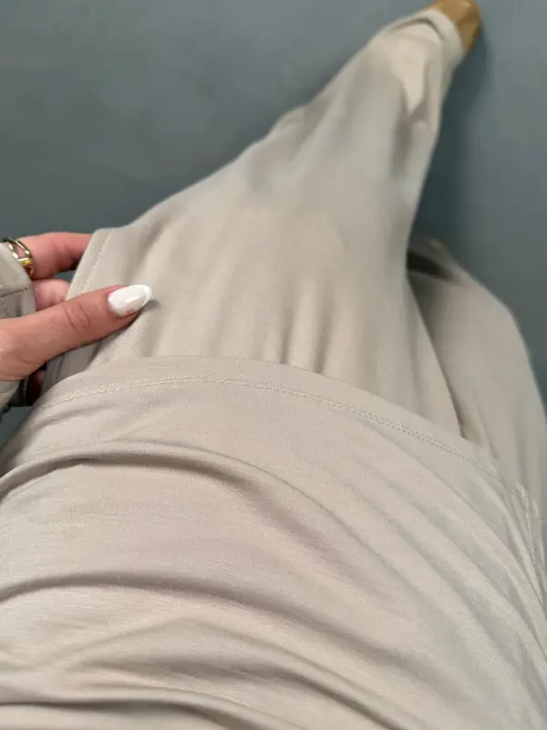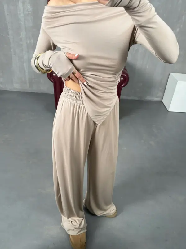 - Donji dio: Široke palazzo hlače s elastičnom gumom u struku za maksimalnu udobnost i slobodu pokreta.