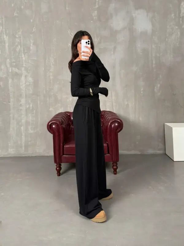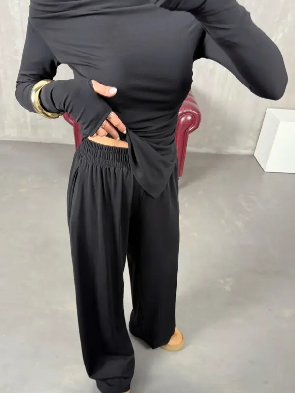- Donji dio: Široke palazzo hlače s elastičnom gumom u struku za maksimalnu udobnost i slobodu pokreta.