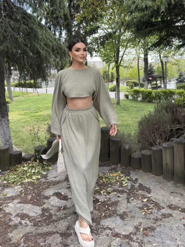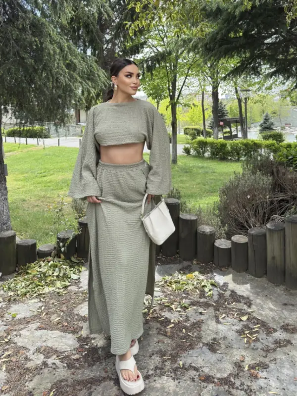 Ovaj chic set sastoji se od crop topa širokih rukava i duge suknje sa visokim prorezom i skrivenim šorcem – spoj stila i praktičnosti u jednom. Teksturirana tkanina daje dodatnu dozu opuštene elegancije, dok rastezljiv struk omogućava savršeno pristajanje.