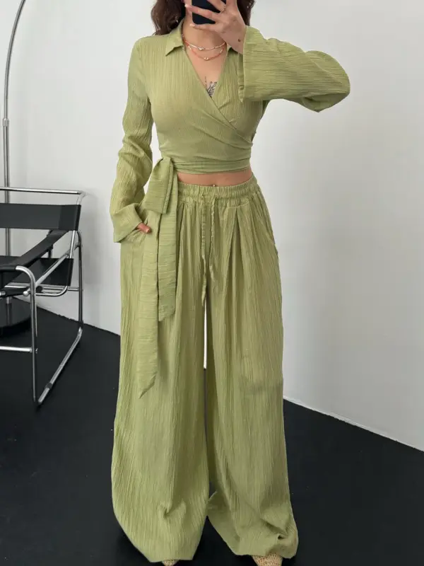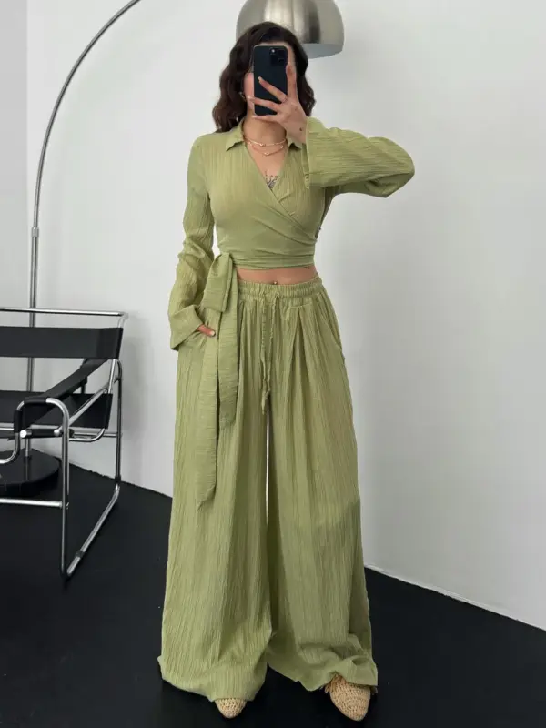 Dvodjelni ženski set – elegantna opuštenost s preklopom i širokim nogavicama 🌿
