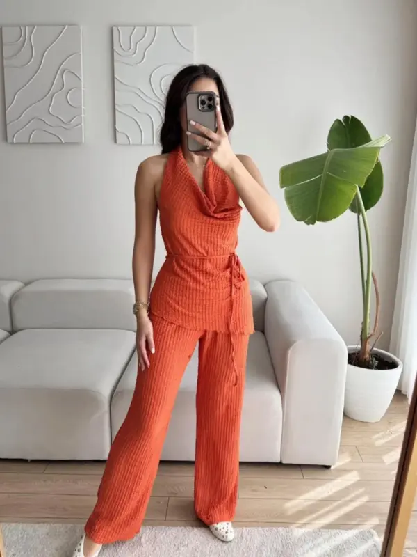 Zamišljen za tople dane i duge šetnje uz more, ovaj dvodijelni set je oličenje ljetne elegancije. Gornji dio s efektnim “waterfall” dekolteom i vezanjem oko struka naglašava siluetu, dok široke nogavice pantalona i guma u struku produžuju figuru i pružaju maksimalnu udobnost.