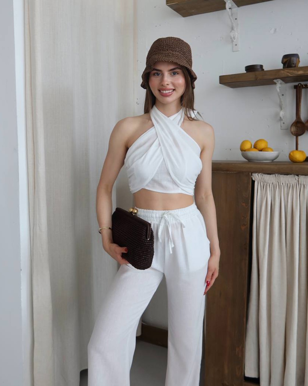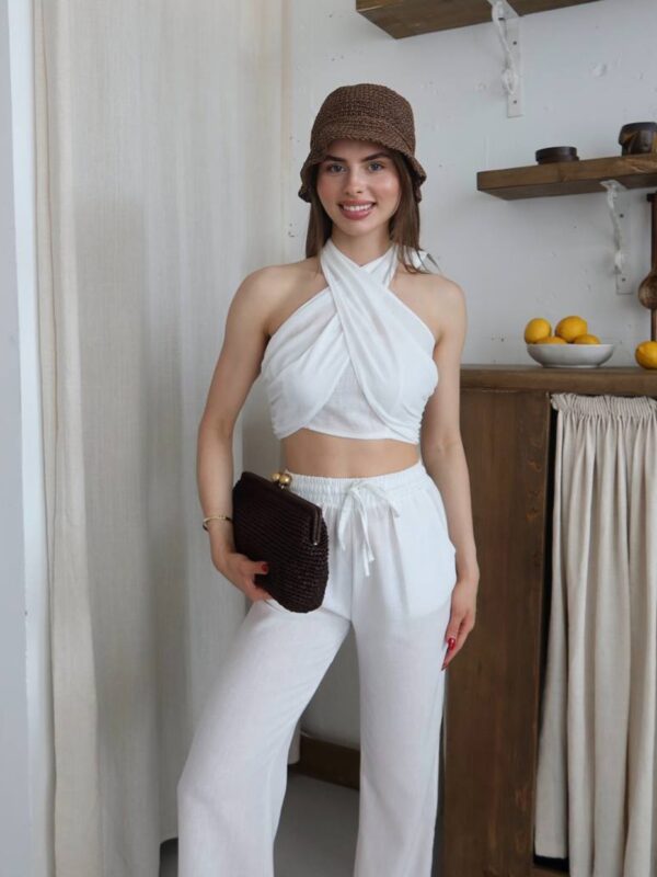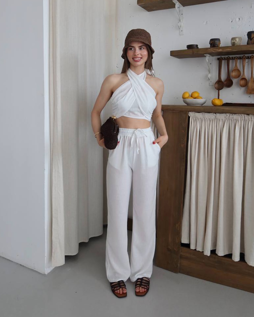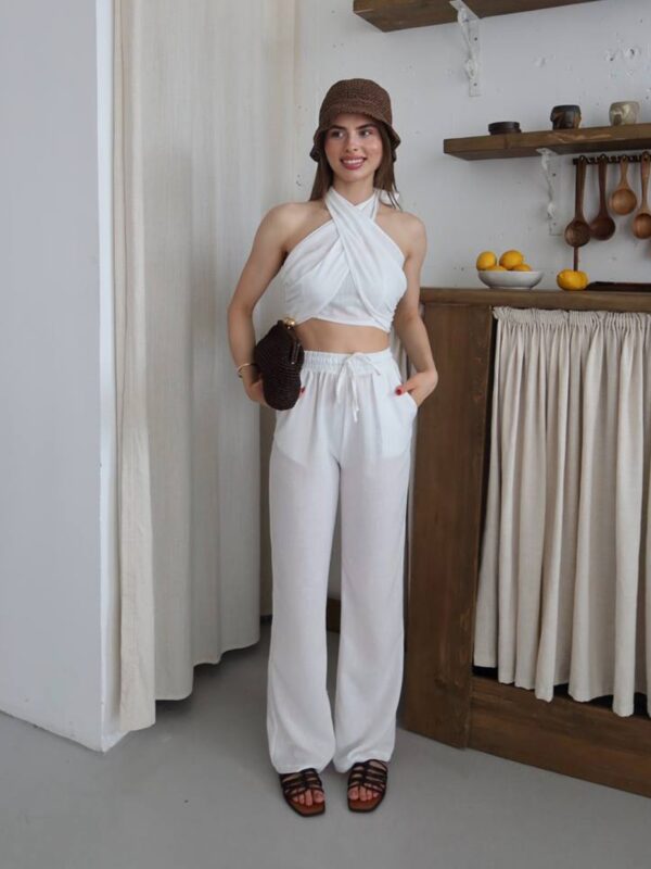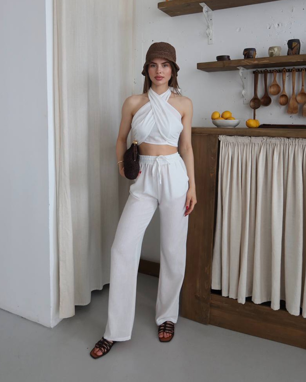 Ovaj komplet spaja sofisticiranost i udobnost u savršenom balansu! Preklopljeni top bez rukava s halter vezanjem oko vrata ističe ramena i dekolte, dok elastična guma na leđima omogućava udobno prianjanje. Široke hlače s visokim strukom i elastičnom gumom pružaju opušten izgled uz dozu elegancije. Blago providan materijal daje dodatnu lakoću ovom modernom setu.