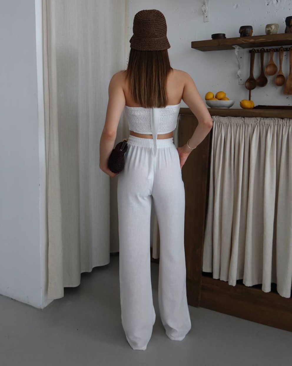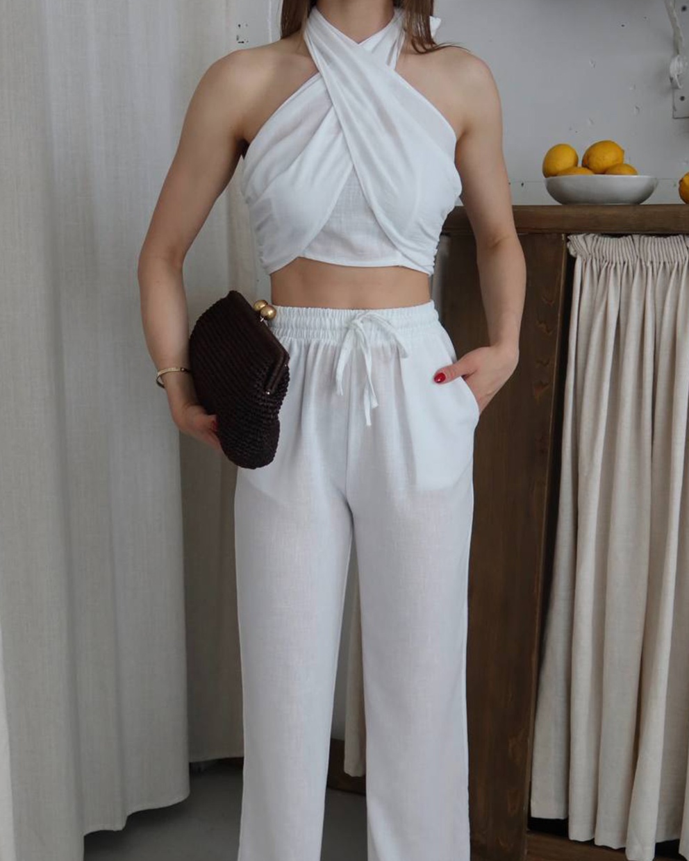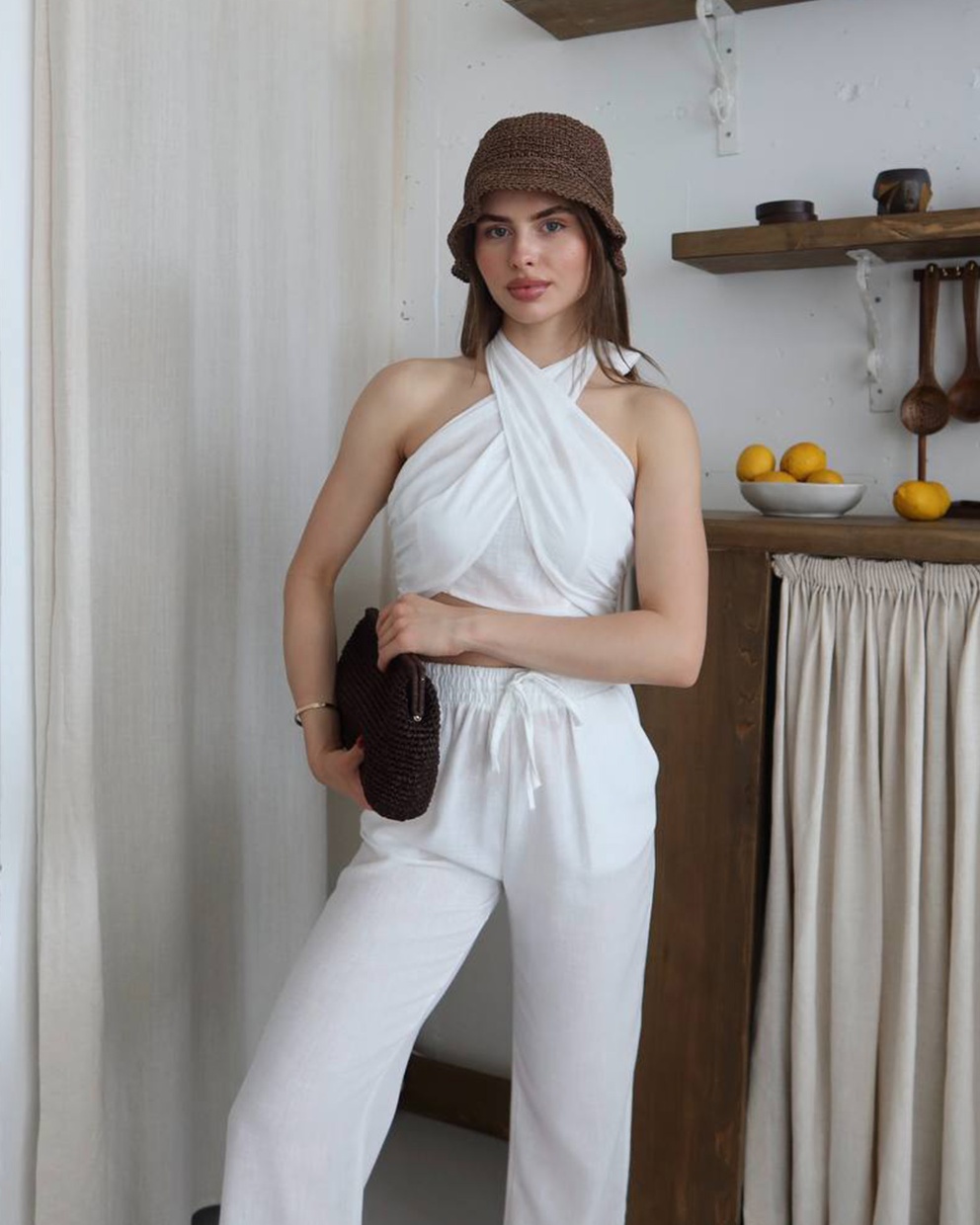 Ovaj komplet spaja sofisticiranost i udobnost u savršenom balansu! Preklopljeni top bez rukava s halter vezanjem oko vrata ističe ramena i dekolte, dok elastična guma na leđima omogućava udobno prianjanje. Široke hlače s visokim strukom i elastičnom gumom pružaju opušten izgled uz dozu elegancije. Blago providan materijal daje dodatnu lakoću ovom modernom setu.