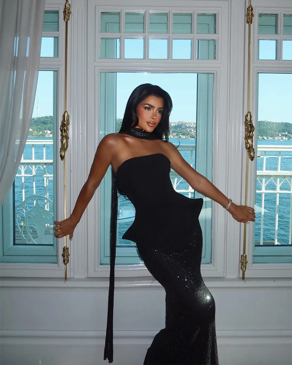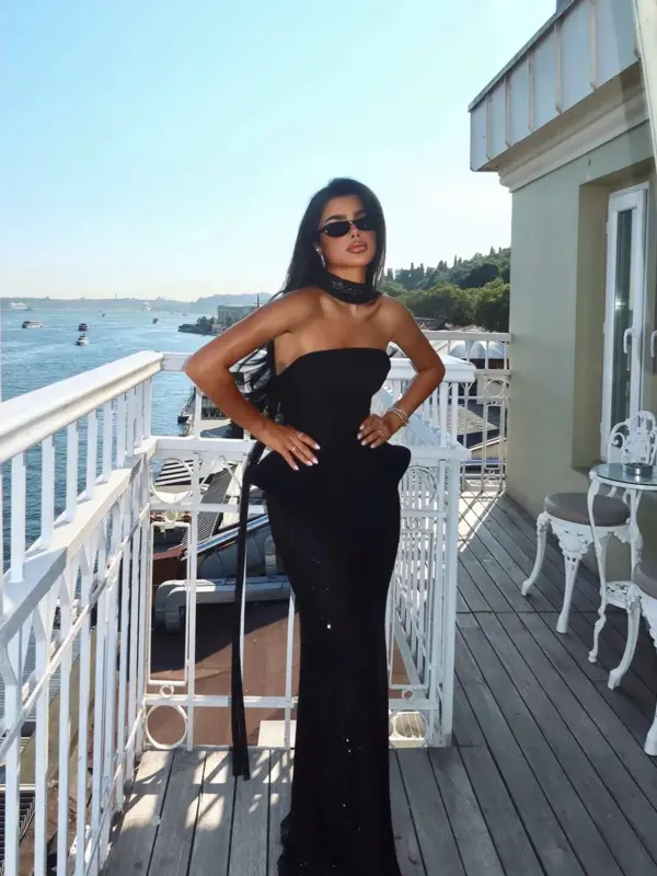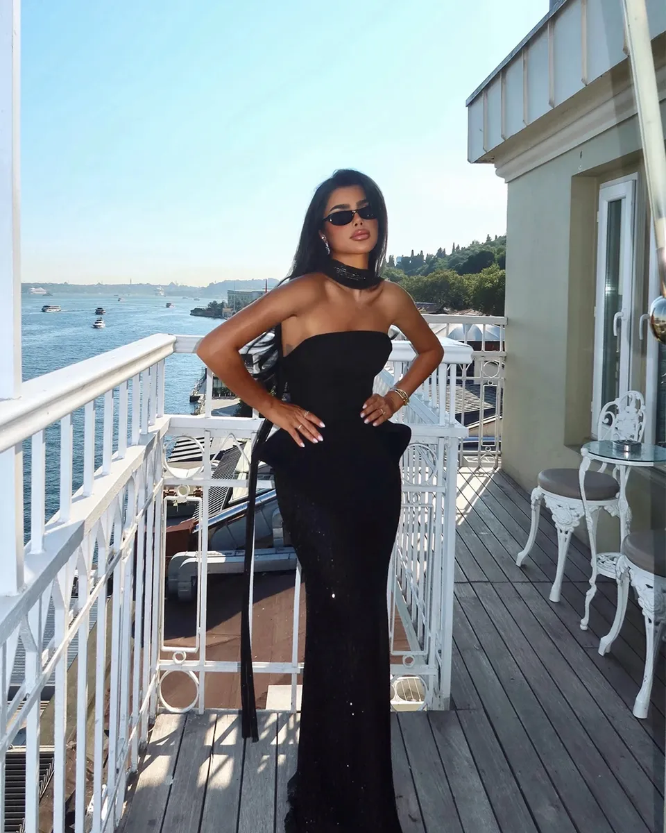 Elegantan i skulpturalan komplet koji spaja couture siluetu i diskretni sjaj – idealan za vjenčanja, svečane večeri i gala događaje.