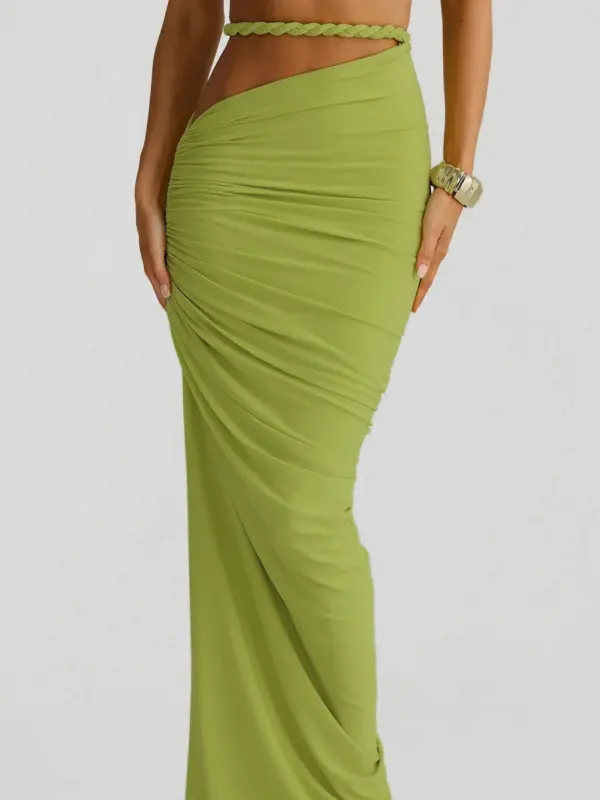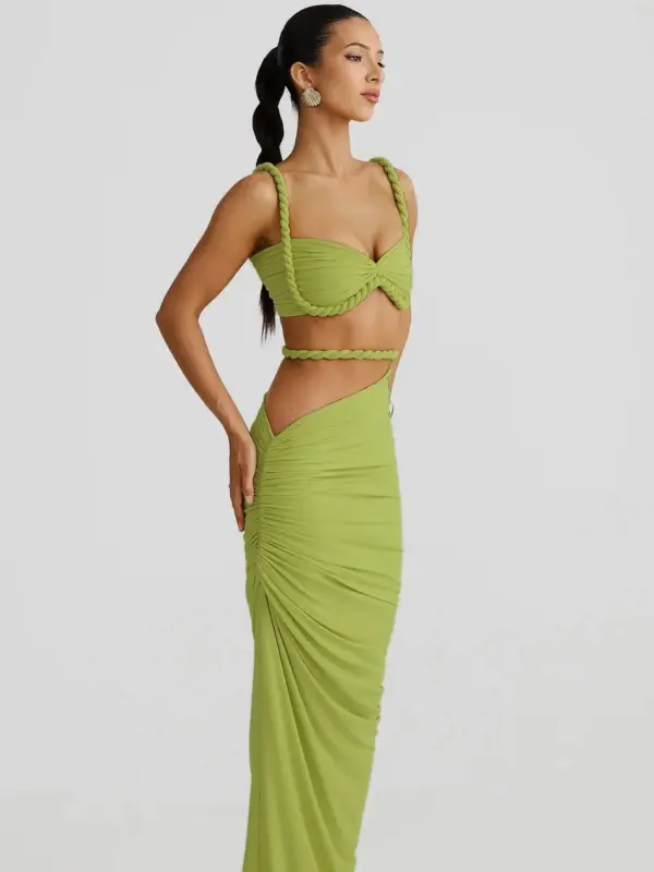 Crop top ima upečatljiv dizajn s bretelama i trakom koje podsjećaju na pletenicu. Gornji dio je podstavljen za udobnost. Duga suknja prati liniju tijela i ima drapirane detalje sa strane. U struku se nalazi udobna guma, a donji dio suknje unosi dinamiku. Ovaj set garantuje da ćete biti primijećeni!