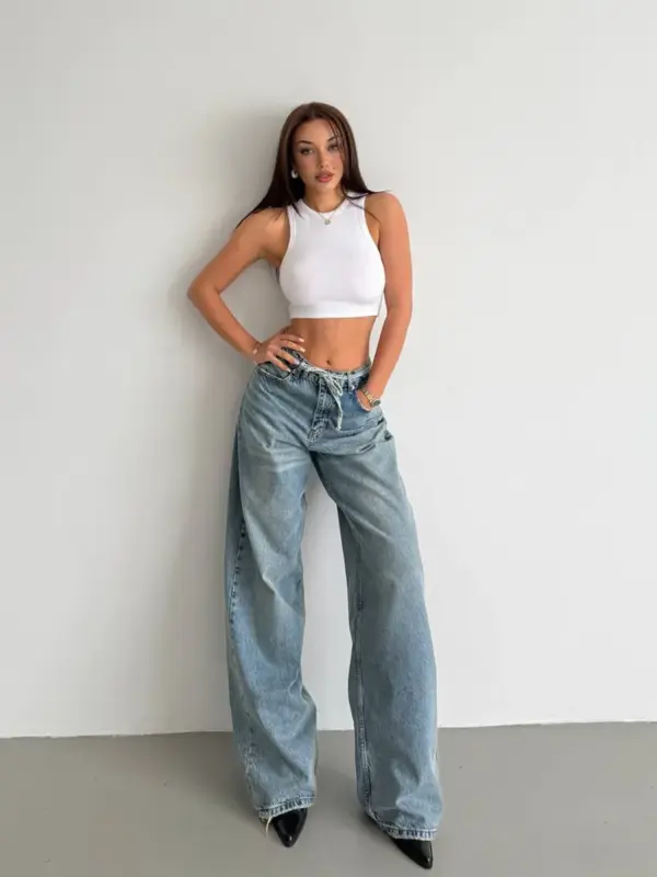 Ako voliš street style s dozom retro šmeka, ove široke baggy farmerice su pravi ulov! Lagano isprani jeans u vintage stilu, visok struk i dodatak pertli umjesto klasičnog remena daju im ležeran, ali moćan vibe. Široke nogavice daju potpunu slobodu kretanja i savršeno se slažu uz crop topove, oversized košulje ili basic majice.