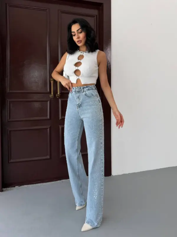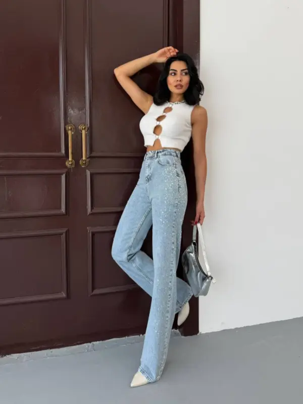 Ravne nogavice, visoki struk i elegantni kristali raspoređeni po prednjem dijelu čine ove farmerice pravim statement komadom. Idealne su za kombinovanje uz basic topove, bluze i štikle ili patike – za dan ili noć.
