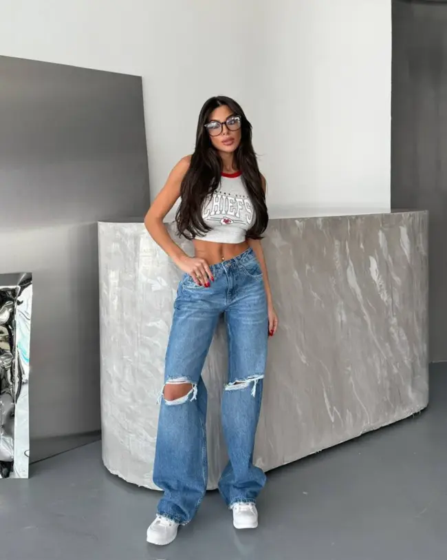 Jednostavne i trendi basic farmerice širokih nogavica, savršene za svakodnevne kombinacije. Srednji struk pruža udobnost i ističe figuru, dok izderani detalji daju moderan, ležeran izgled.