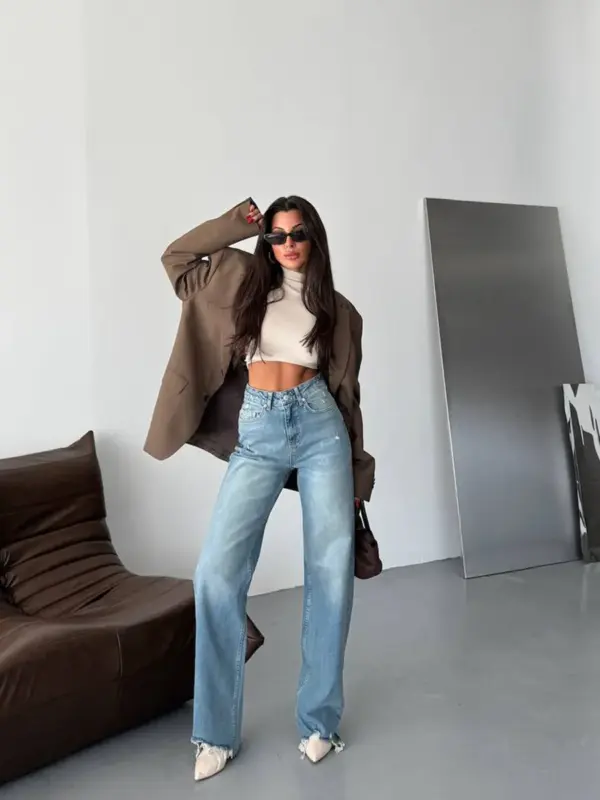 Jednostavne i trendi basic farmerice širokog kroja, savršene za svakodnevne kombinacije. Visoki struk pruža udobnost i ističe figuru, dok neobrađeni donji porub sa izderanim detaljem daje moderan, ležeran izgled. Klasični džepovi sprijeda i pozadi dodaju praktičnost ovom bezvremenskom modelu.