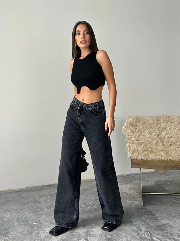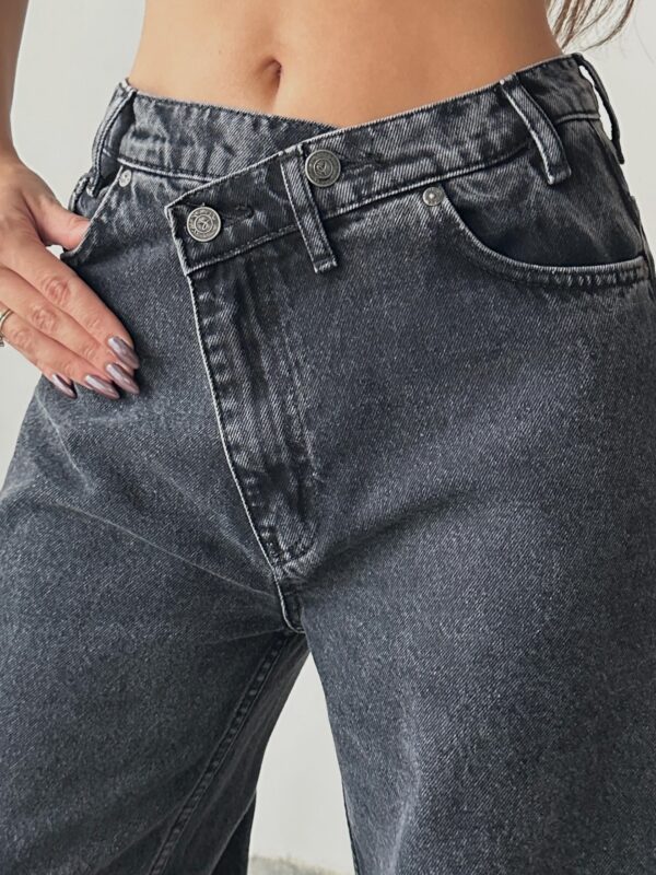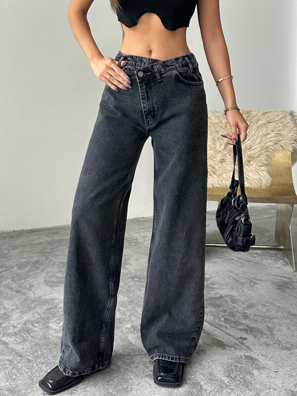 Ove farmerice donose savremen i trendi izgled zahvaljujući posebnom kosom kopčanju koje naglašava struk i daje zanimljiv vizuelni efekat. Model je rađen u opuštenom, širokom kroju koji pruža udobnost i lako se kombinuje uz različite stilove.