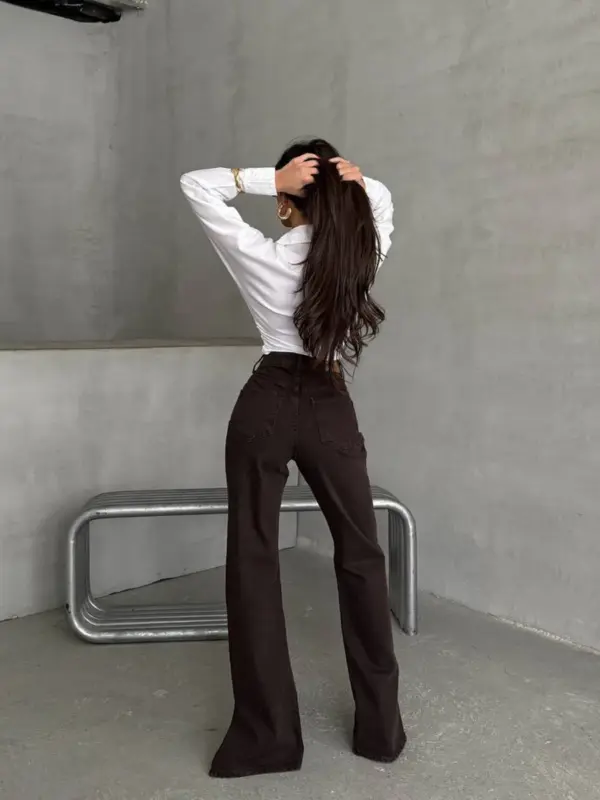 Jednostavne i trendi basic farmerice širokog kroja, savršene za svakodnevne kombinacije. Visoki struk pruža udobnost i ističe figuru, dok detalj sa kosim kopčanjem daje moderan, ležeran izgled. Klasični džepovi sprijeda i pozadi dodaju praktičnost ovom bezvremenskom modelu.