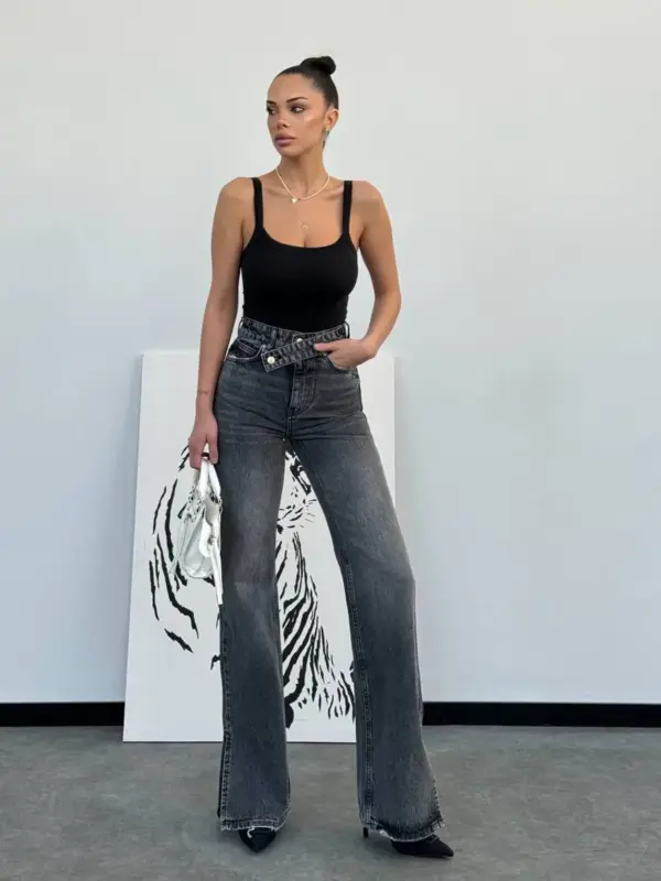 Osvježite svoju kolekciju traperica ovim jedinstvenim modelom s asimetričnim kopčanjem! Ove farmerice visokog struka donose moderan pomak klasičnom dizajnu. Kopčanje na koso dodaje edgy detalj i čini ih pravim statement komadom.