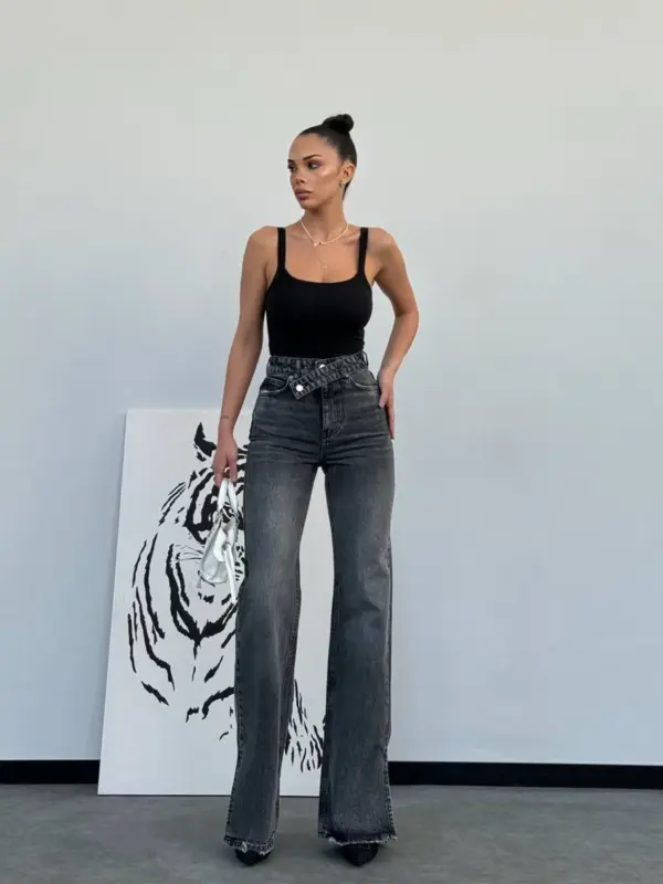 Osvježite svoju kolekciju traperica ovim jedinstvenim modelom s asimetričnim kopčanjem! Ove farmerice visokog struka donose moderan pomak klasičnom dizajnu. Kopčanje na koso dodaje edgy detalj i čini ih pravim statement komadom.