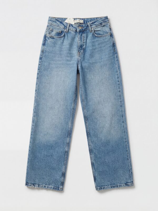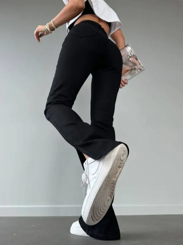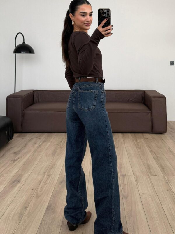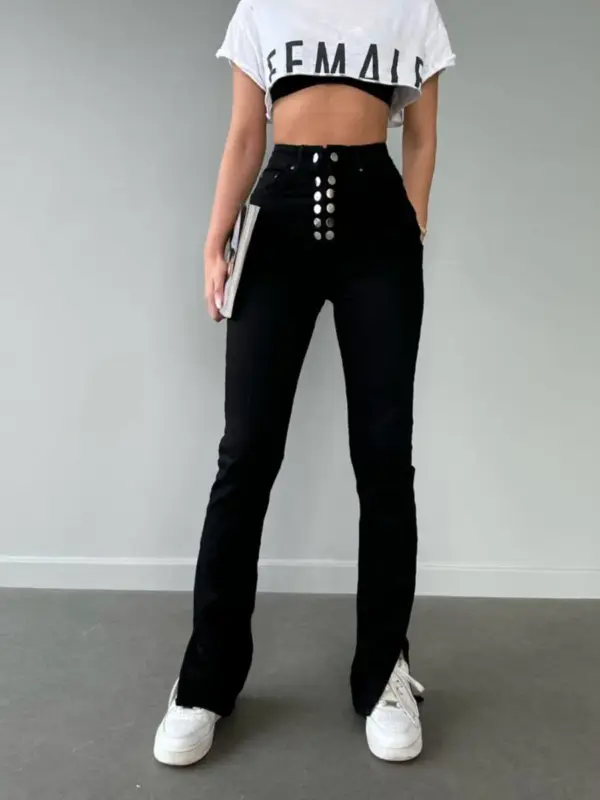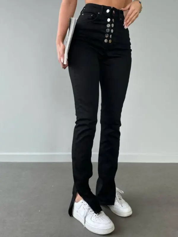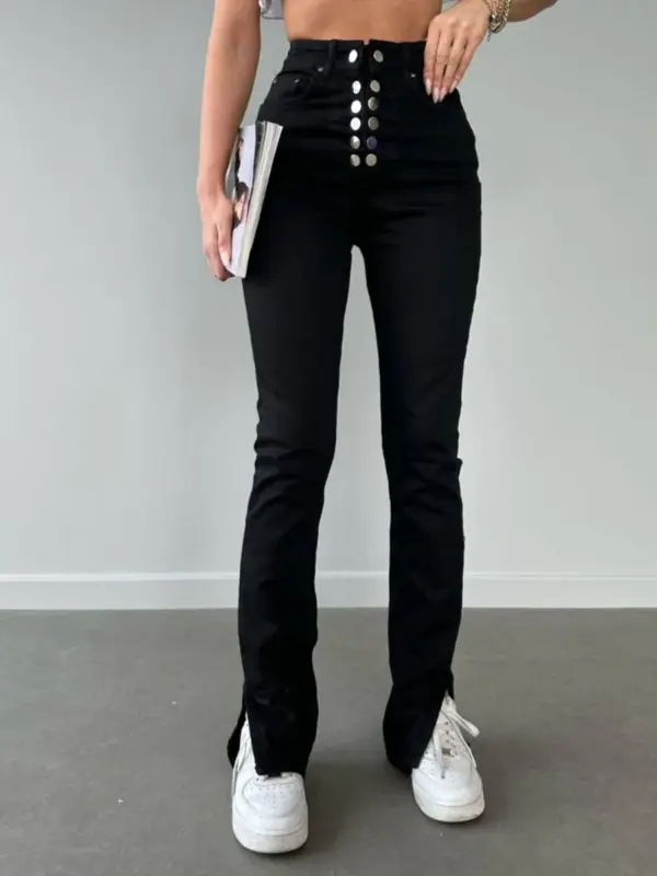 Ove farmerice sa uskim nogavicama koje se završavaju prorezom pri dnu donose savršen spoj udobnosti i stila! Ističu se zanimljivim detaljem rajfešlusa i dugmadi, dodajući unikatan pečat klasičnom kroju.