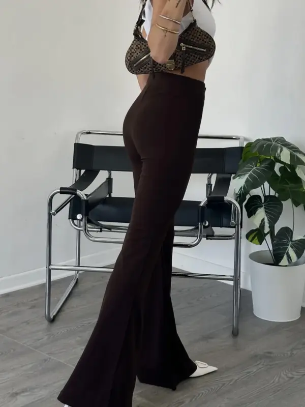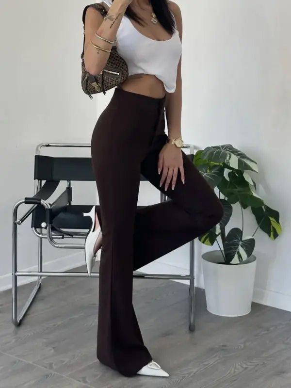 Ove hlače visokog struka izrađene su od kvalitetnog, elastičnog materijala koji lijepo prijanja uz tijelo i pruža udobnost tokom cijelog dana. Minimalistički dizajn čini ih savršenim izborom za razne prilike – od poslovnog do večernjeg outfita.