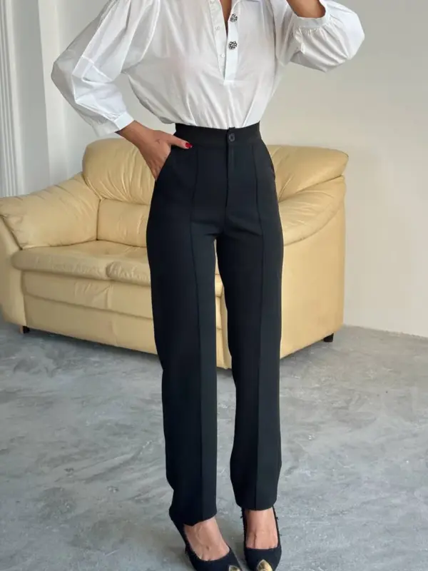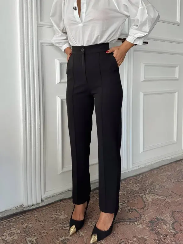 🔹 Kroj: Hlače visokog struka, ravne nogavice