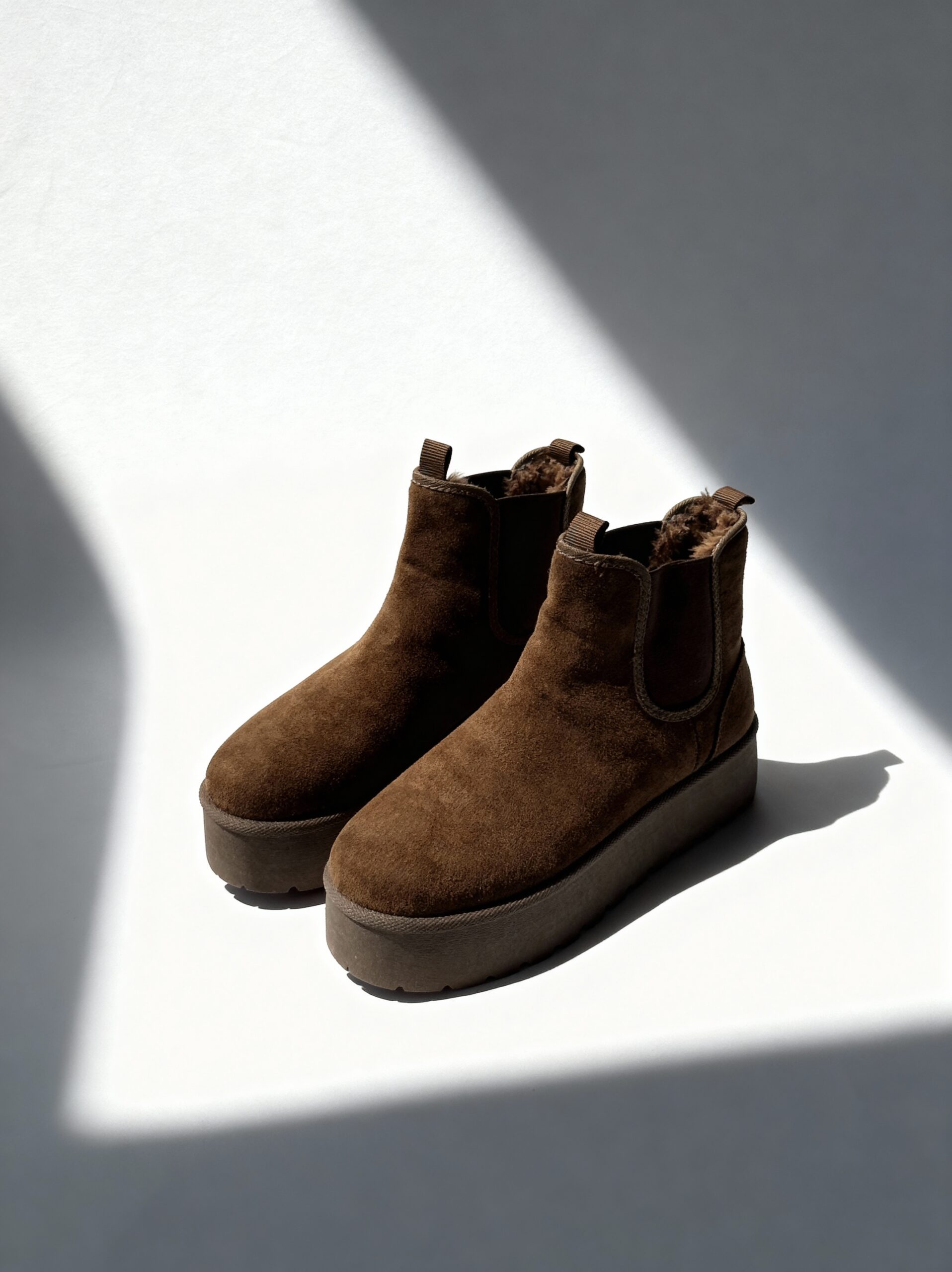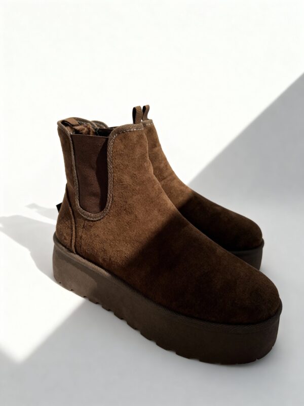 Ove smeđe zimske čizme izrađene su od eko brušene kože, koji im daje mekan, luksuzan izgled i izuzetno prijatan osjećaj na dodir. Model je dizajniran kao kombinacija cozy UGG estetike i praktičnosti Chelsea čizama, uz elastične bočne umetke koji olakšavaju obuvanje.