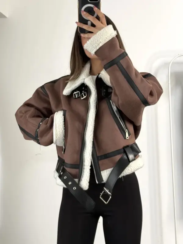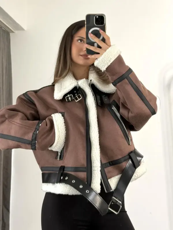 Ova kontrastna cropped jakna izrađena je od umjetne brušene kože s toplom unutrašnjošću od imitacije janjećeg runa, savršena za hladne dane kada želite izgledati moderno i osjećati se ugodno. Preklop sa patentnim zatvaračem pruža dodatnu zaštitu od vjetra, dok skraćeni kroj naglašava struk i čini jaknu idealnom za slojevite kombinacije.