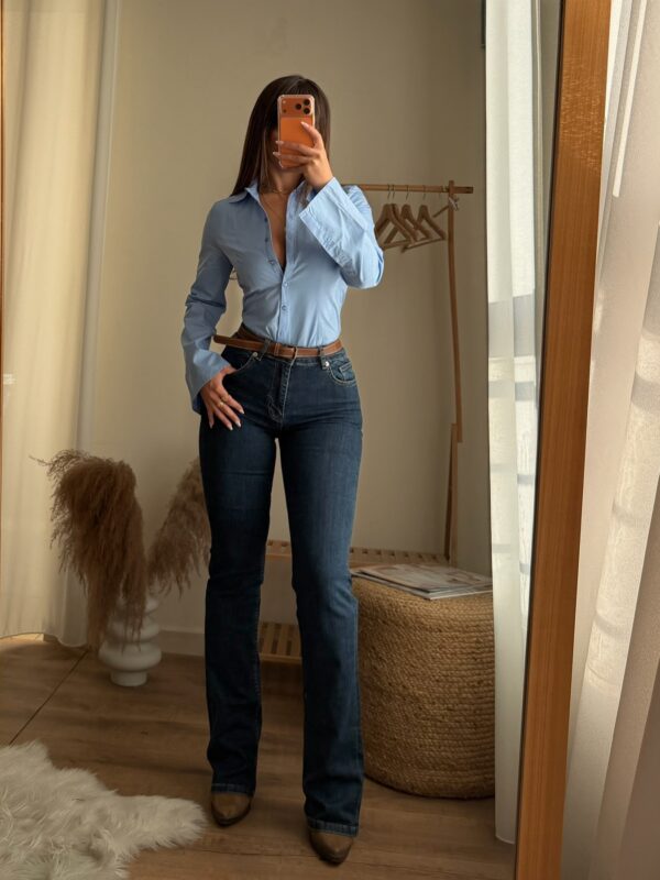 Elegantna i ženstvena pamučna košulja koja kombinuje klasičan kroj sa modernim detaljima.