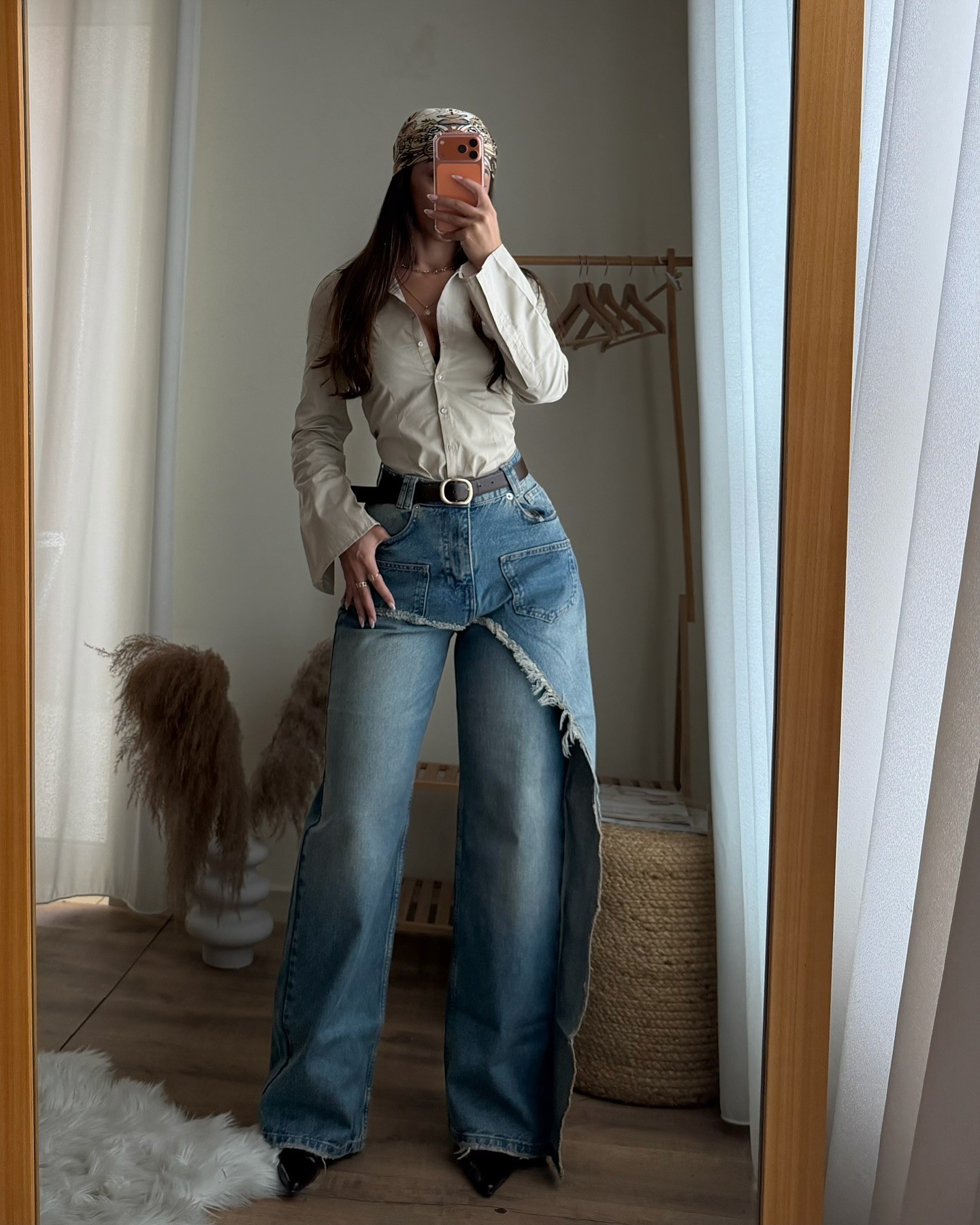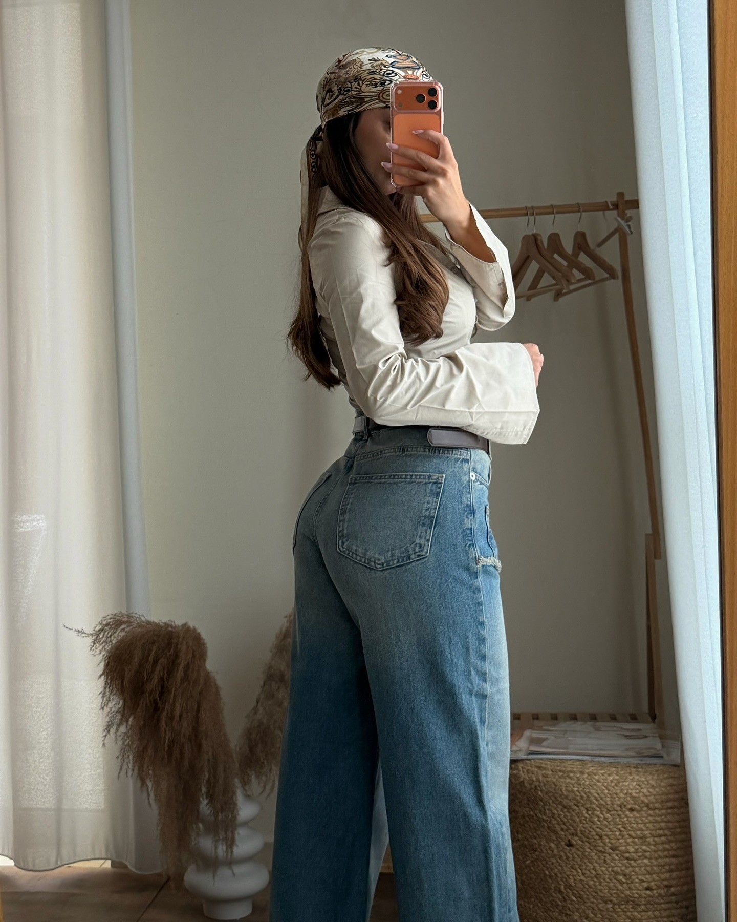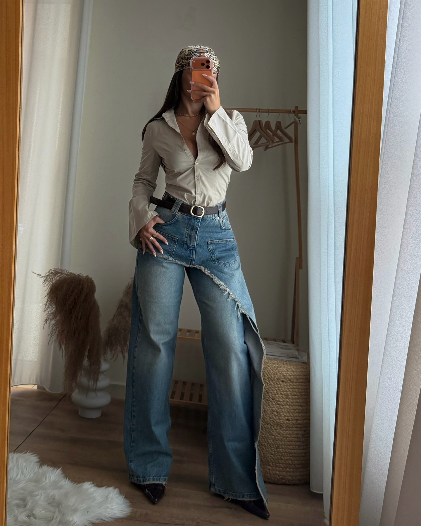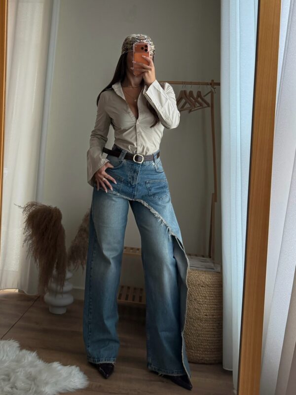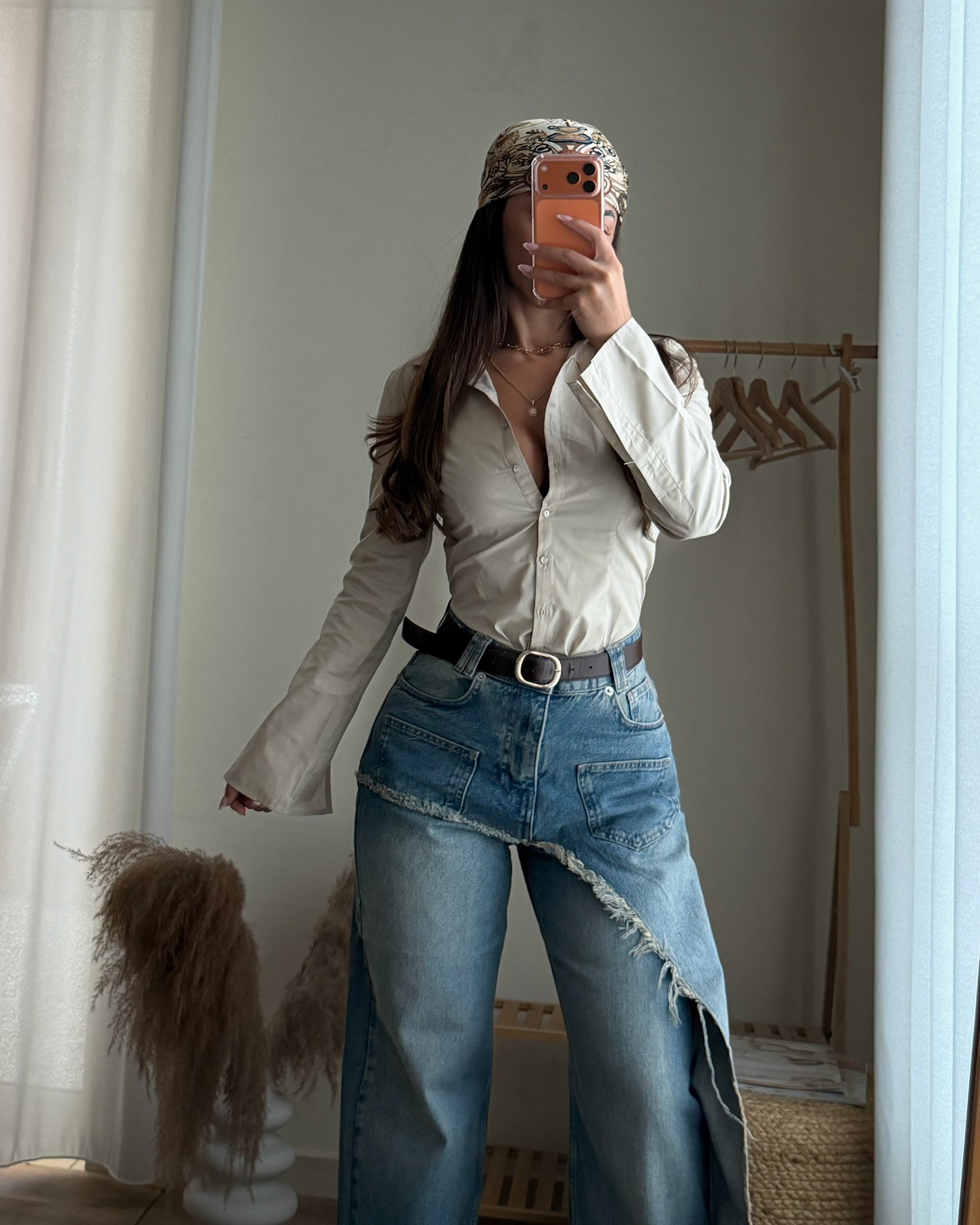 Elegantna i ženstvena pamučna košulja koja kombinuje klasičan kroj sa modernim detaljima.