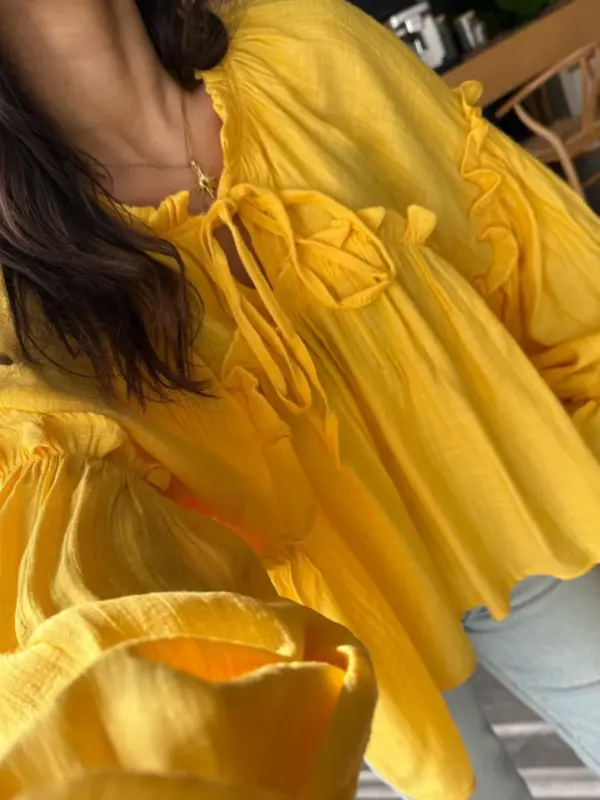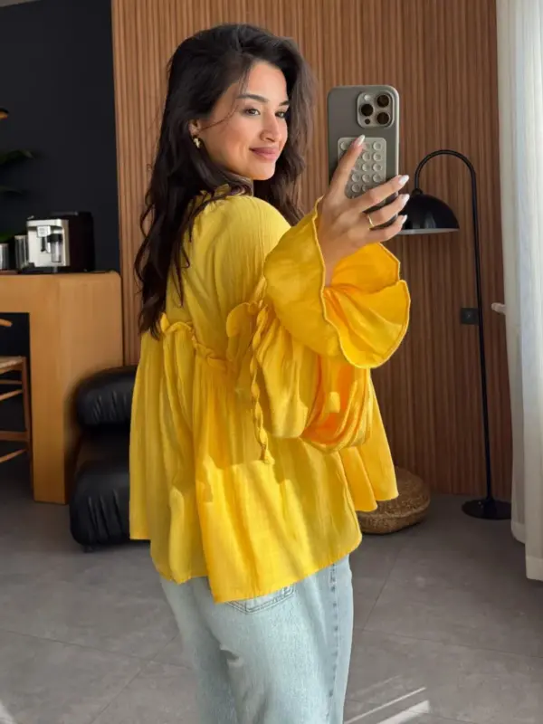 Ova šira košulja s puf rukavima i volanima donosi lagan i romantičan izgled uz dozu ležerne elegancije. Napravljena od prozračnog materijala, savršena je za svakodnevne i chic kombinacije.