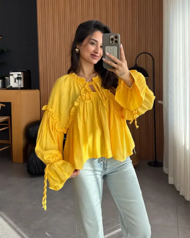 Ova šira košulja s puf rukavima i volanima donosi lagan i romantičan izgled uz dozu ležerne elegancije. Napravljena od prozračnog materijala, savršena je za svakodnevne i chic kombinacije.