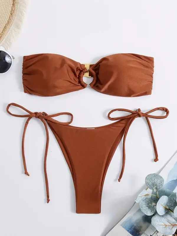 Savršen bikini za ljetne dane na plaži ili bazenu! Gornji dio bez naramenica s metalnim prstenom u sredini pruža zavodljiv izgled i sigurno pristajanje, dok donji dio sa bočnim vezicama omogućava prilagođavanje veličine za savršeno pristajanje. Uklonjive sunđeraste korpice pružaju dodatnu podršku i oblik, uz mogućnost personalizacije.