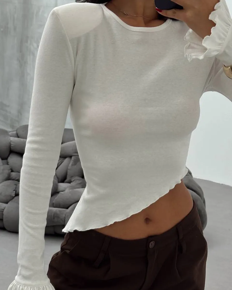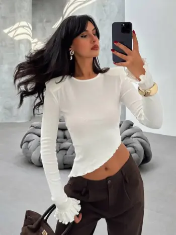 Unesite dozu elegancije u svakodnevni stil s ovom zanimljivom pamučnom majicom, koja kombinuje udobnost i sofisticirane detalje. Asimetrični donji porub dodaje modernu notu, dok volani na rukavima pružaju ženstven i efektniji izgled. Spužvice na ramenima daju strukturu i blago ističu siluetu, dok rastezljiv materijal osigurava udobnost tokom cijelog dana.