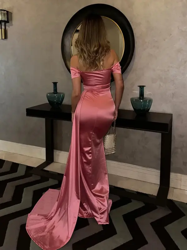 Ova zavodljiva maxi haljina spuštenih ramena odiše sofisticiranošću. Kroj joj daje romantičan izgled, naglašen dekolte, umetnute spužve na grudima i kroj s presjekom u struku naglašavaju figuru. Širi se prema dnu.